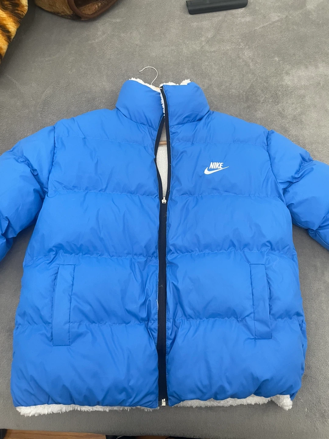 Selling a Nike reversible puffer jacket! It features a cozy sherpa fleece on one side and a classic puffer design on the other. The jacket has the Nike logo on both sides. Great for staying warm and stylish!