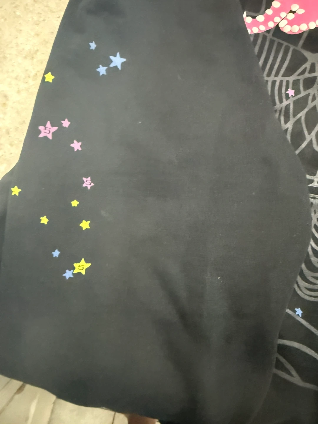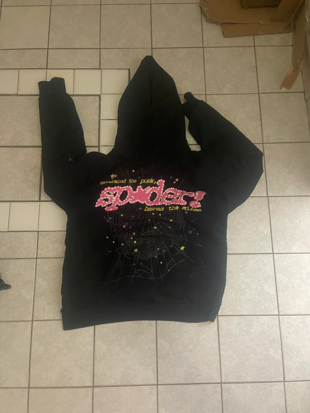 Selling a black Sp5der hoodie in size small. It features a unique design with stars and a spiderweb. The hoodie is in good condition and perfect for adding a stylish touch to your wardrobe! Pick up only