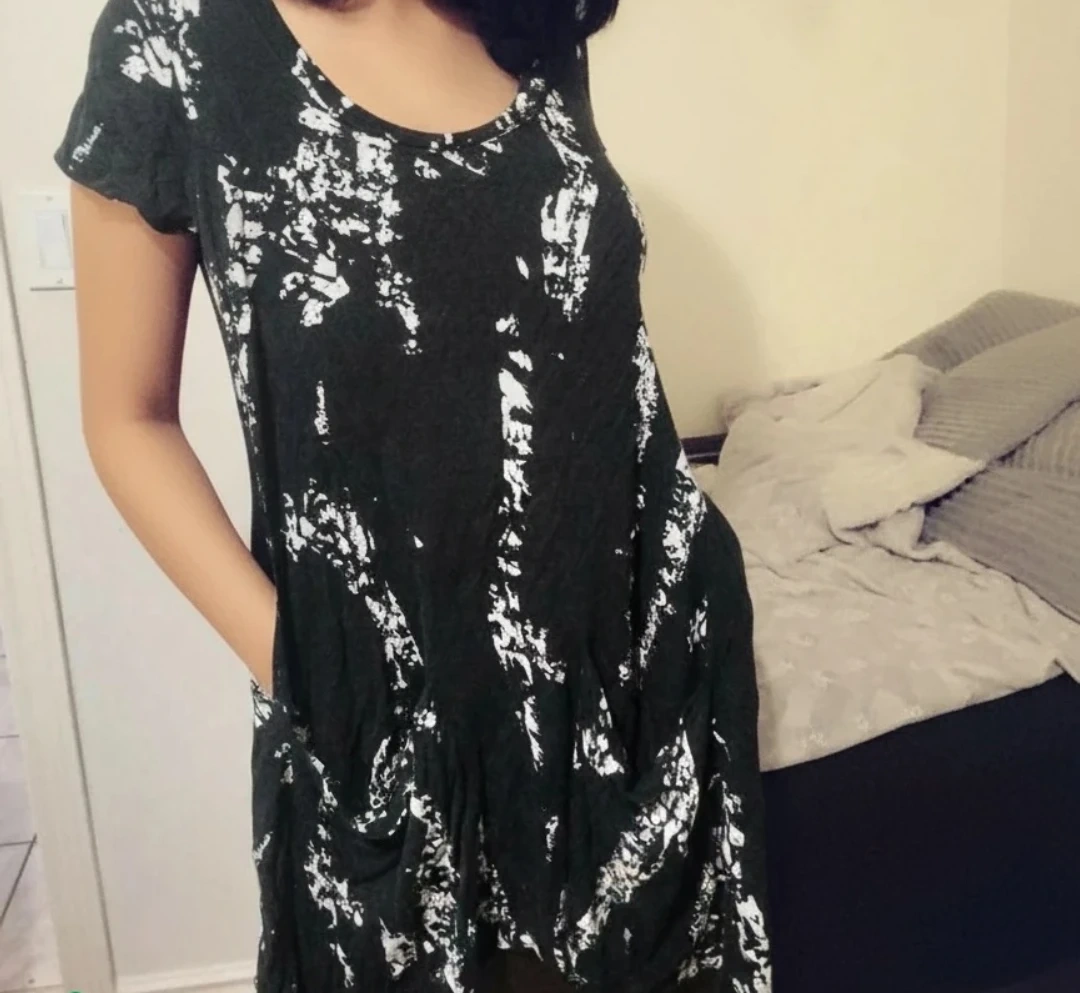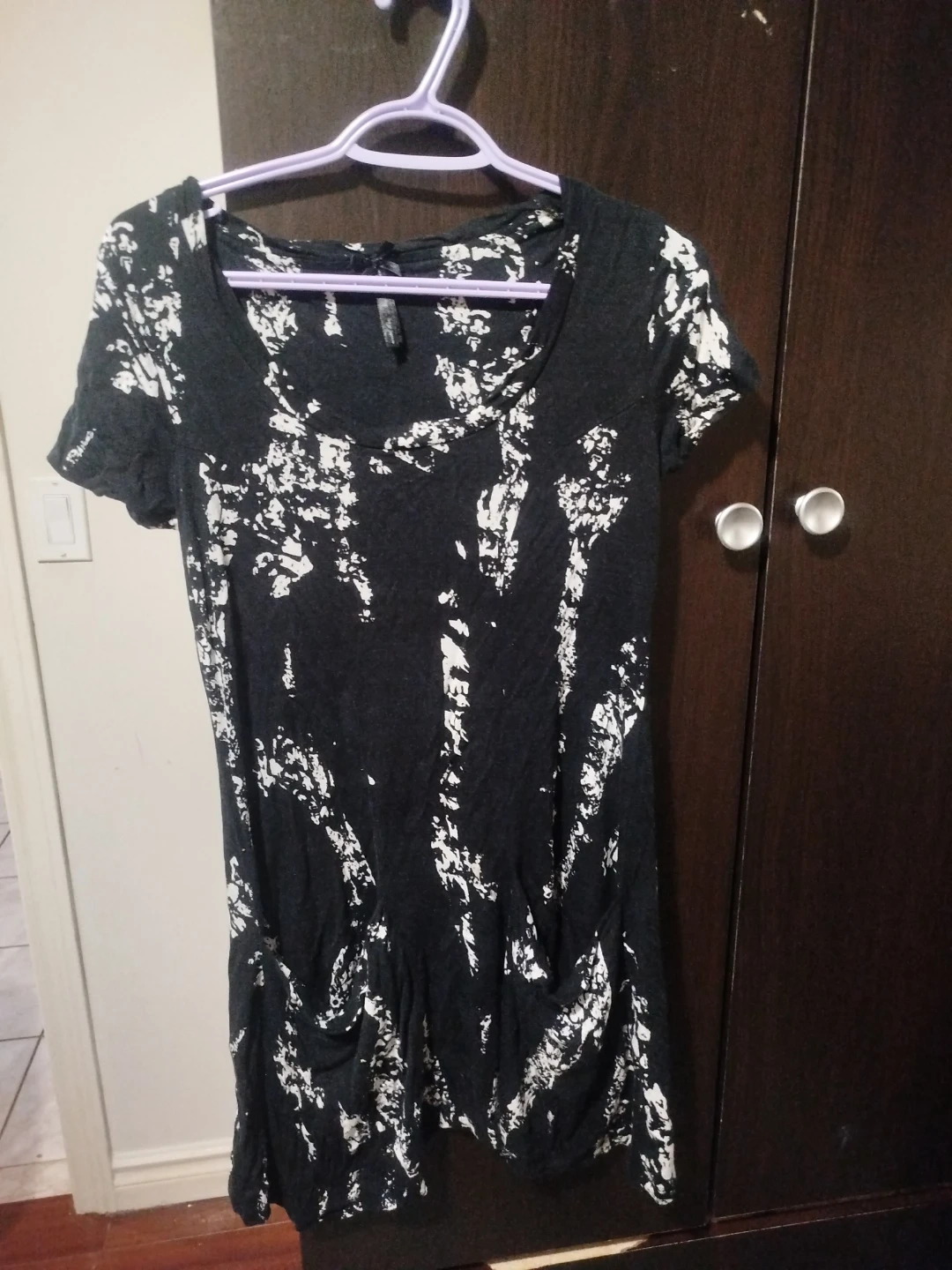 A cute black and white dress with short sleeves and pockets. It's in great condition and ready for a new home! Perfect for a casual day out or dressed up for an evening event