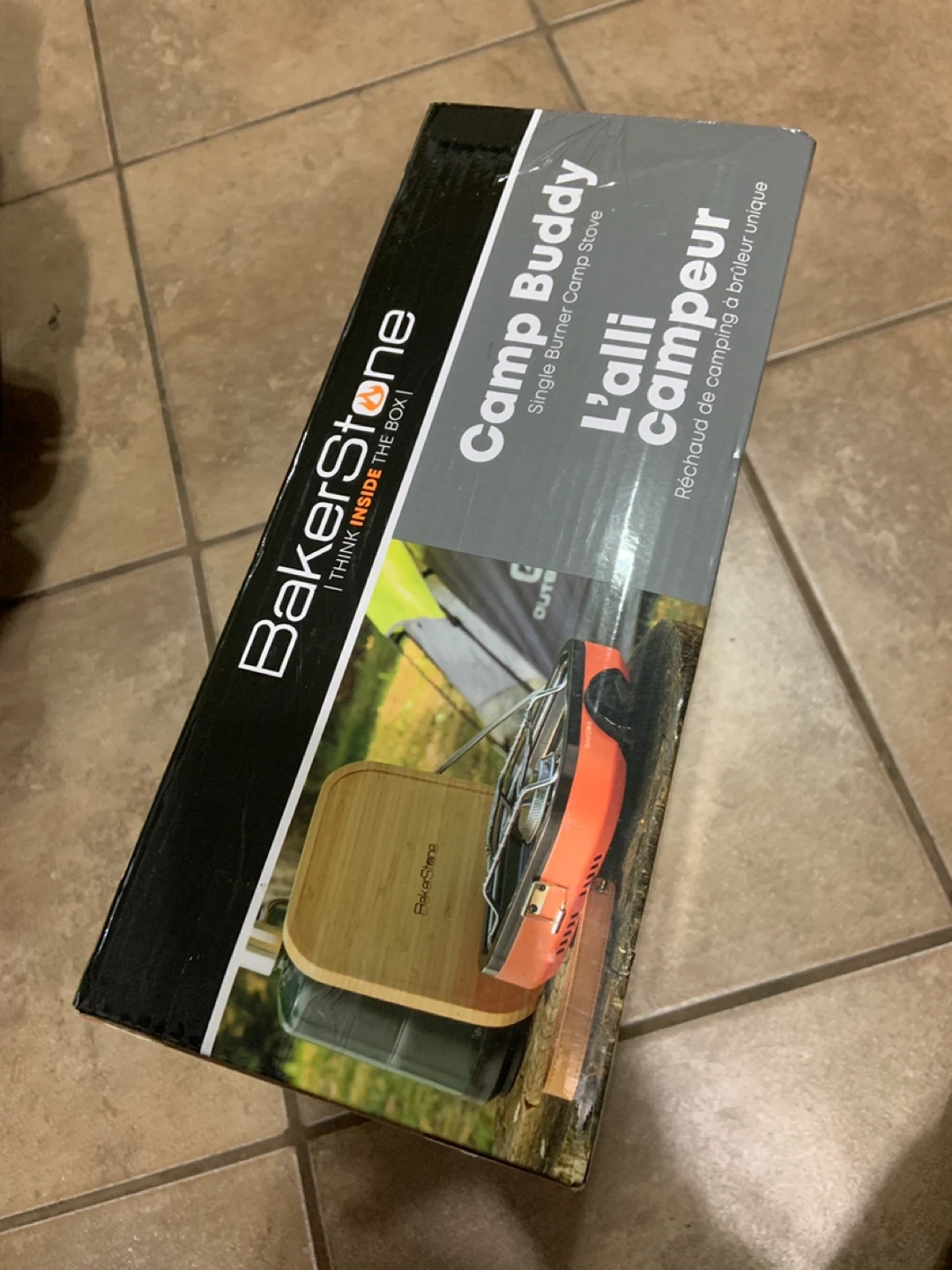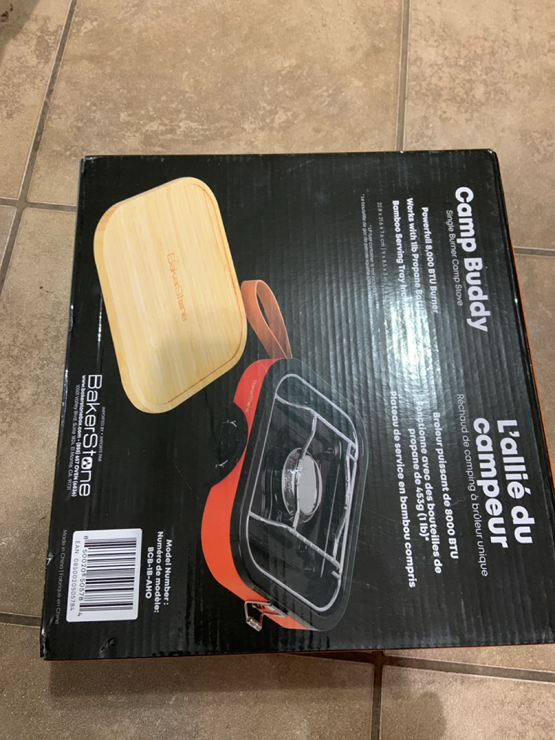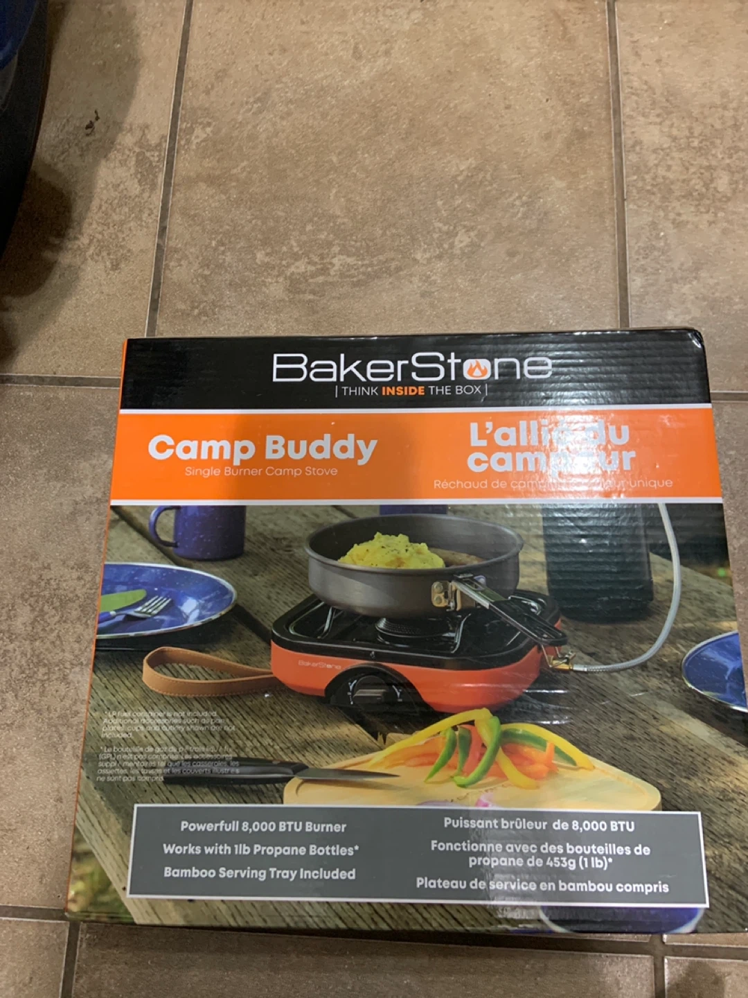 Selling a brand new BakerStone Camp Buddy single burner camp stove, still in its original box! This portable stove features a powerful 8,000 BTU burner and works with 1lb propane bottles. It also includes a bamboo serving tray. Perfect for camping or outdoor cooking!