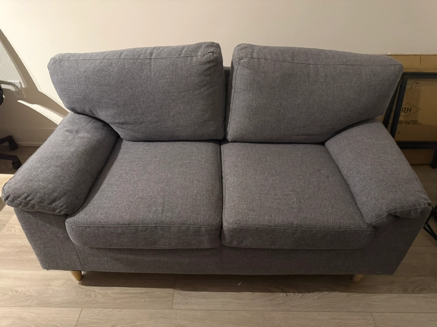 Selling a comfy grey loveseat sofa! It's in great condition and would be perfect for a small space or apartment. The cushions are nice and soft, making it a cozy spot to relax after a long day. It's a great addition to any living room!