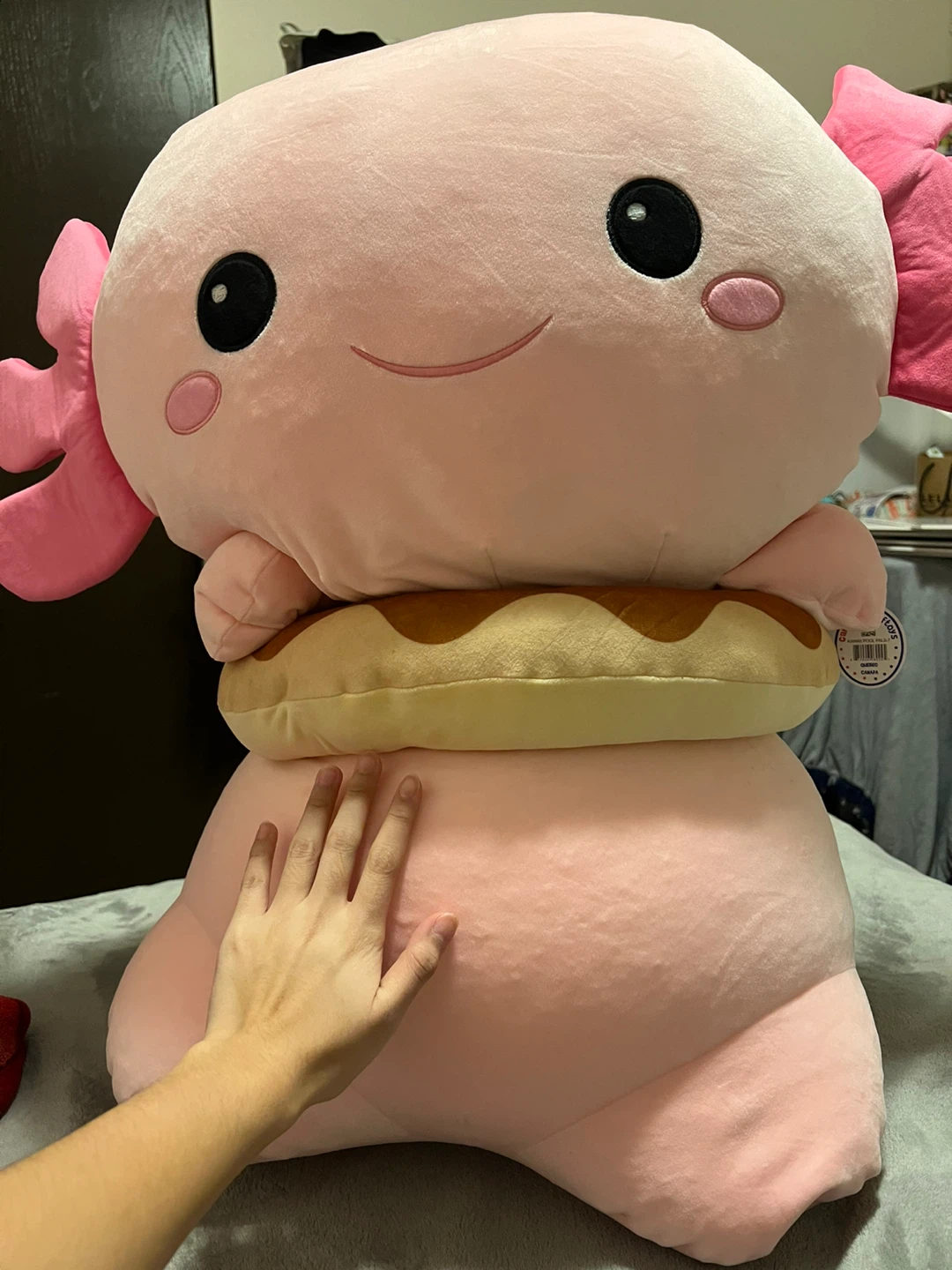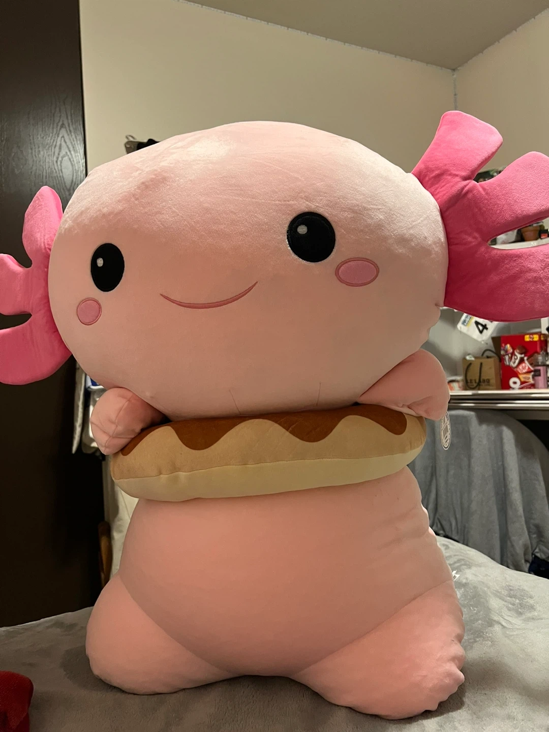 Selling a super cute pink axolotl plushie! It's in great condition and comes with a little donut around its middle. It's a really soft and cuddly plush, perfect for anyone who loves axolotls or just wants a fun, unique stuffed animal