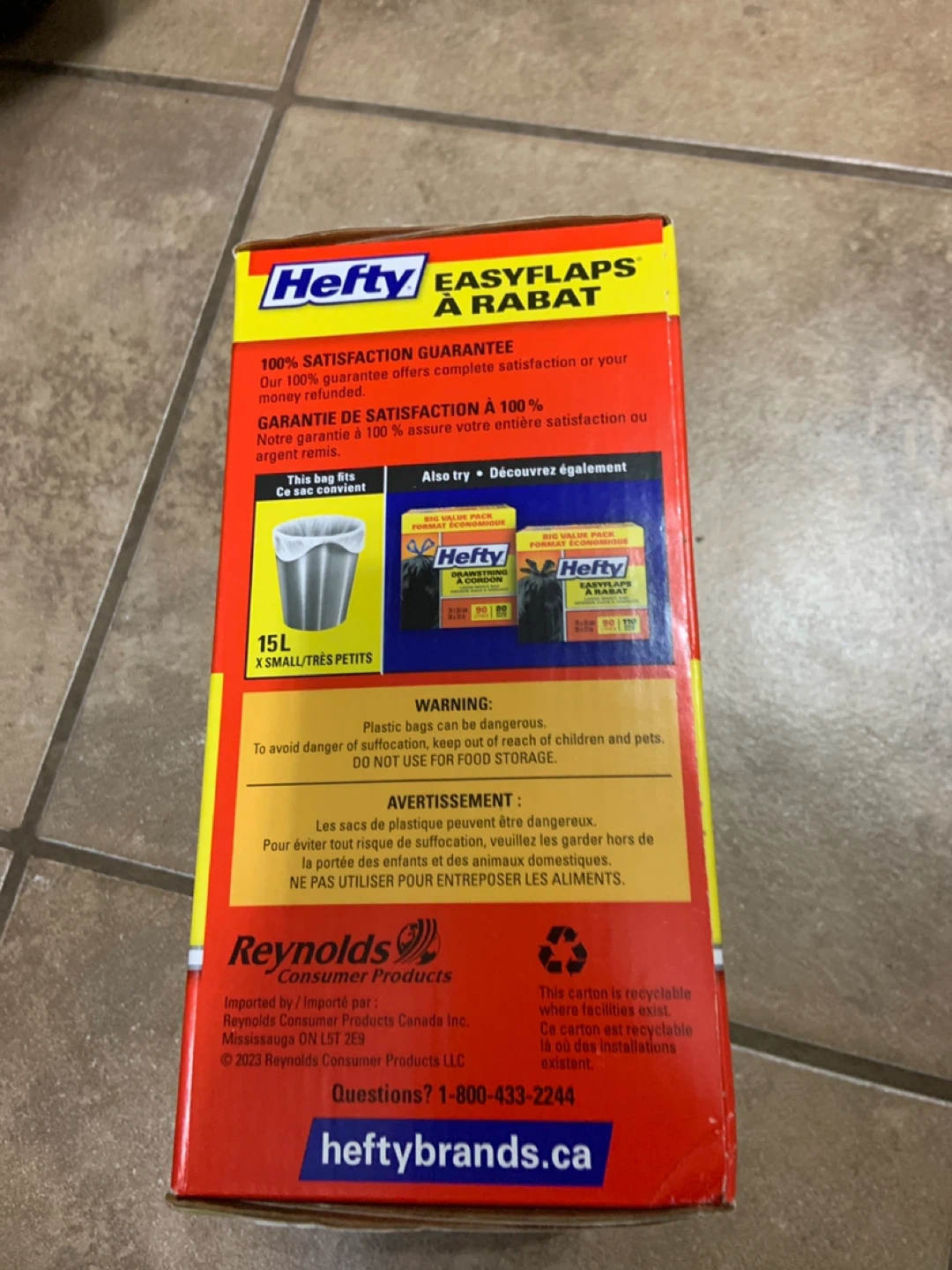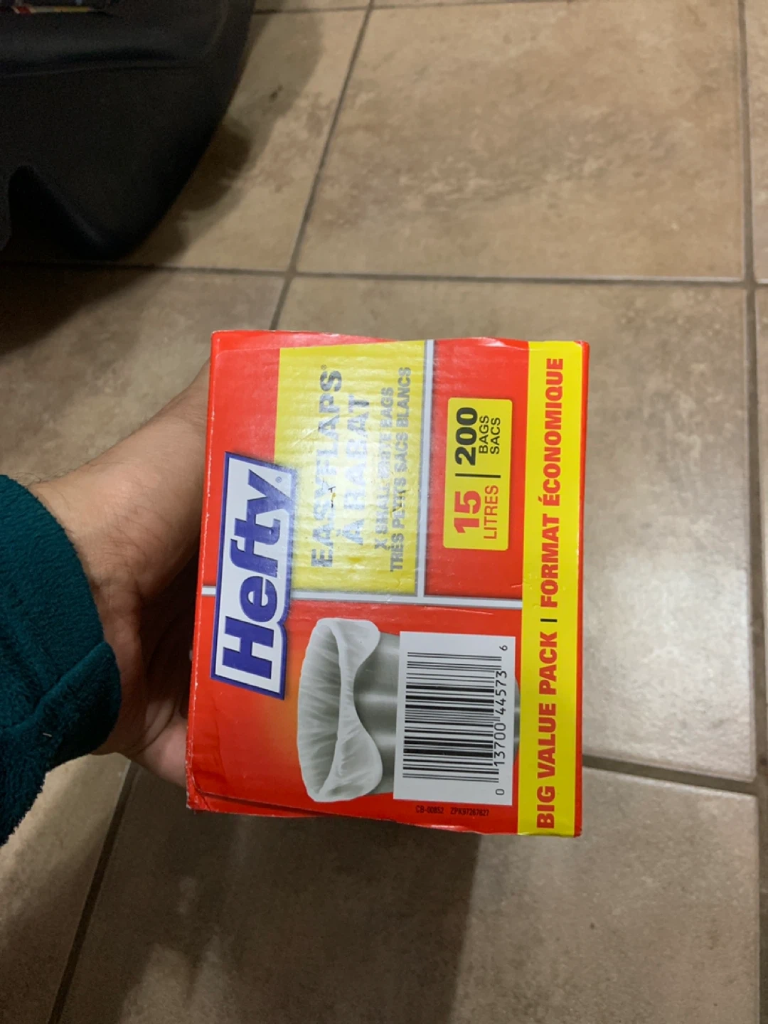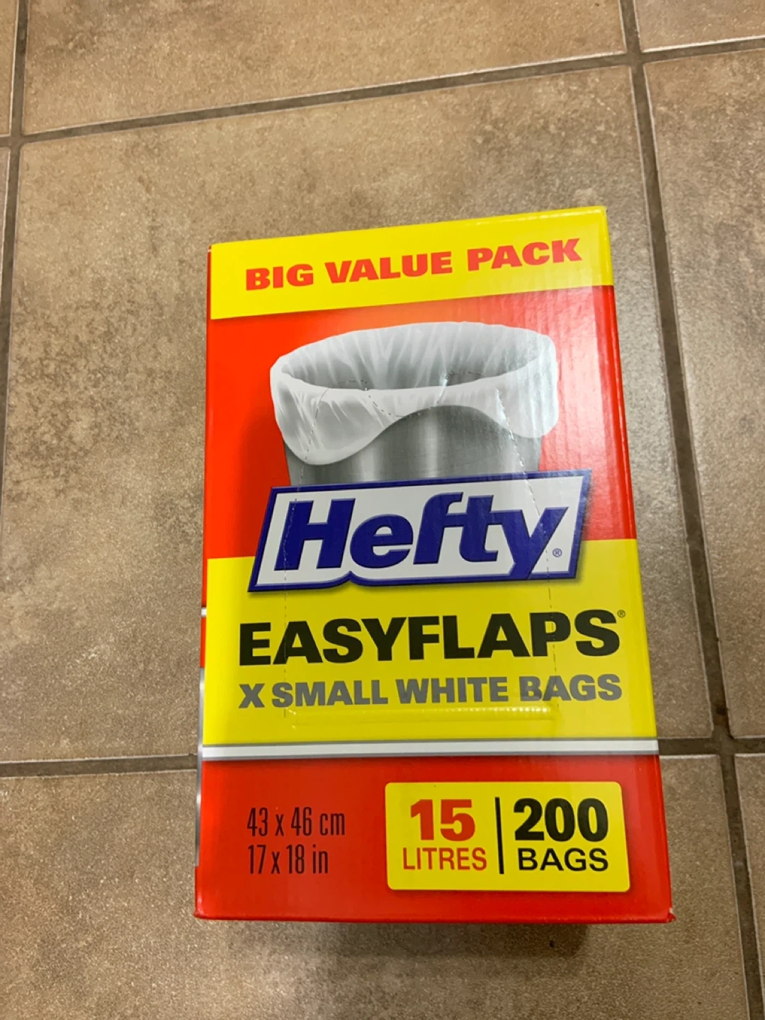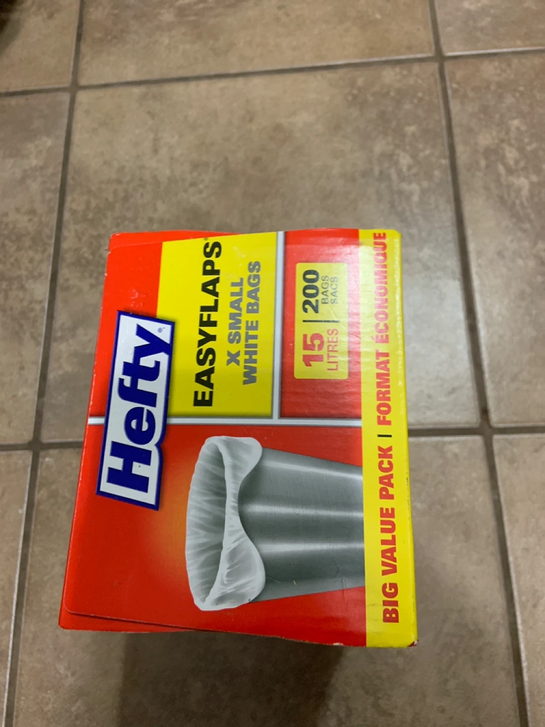 Selling a box of Hefty EasyFlaps small white bags. The box contains 200 bags, each with a 15L capacity. They're perfect for small trash bins around the house