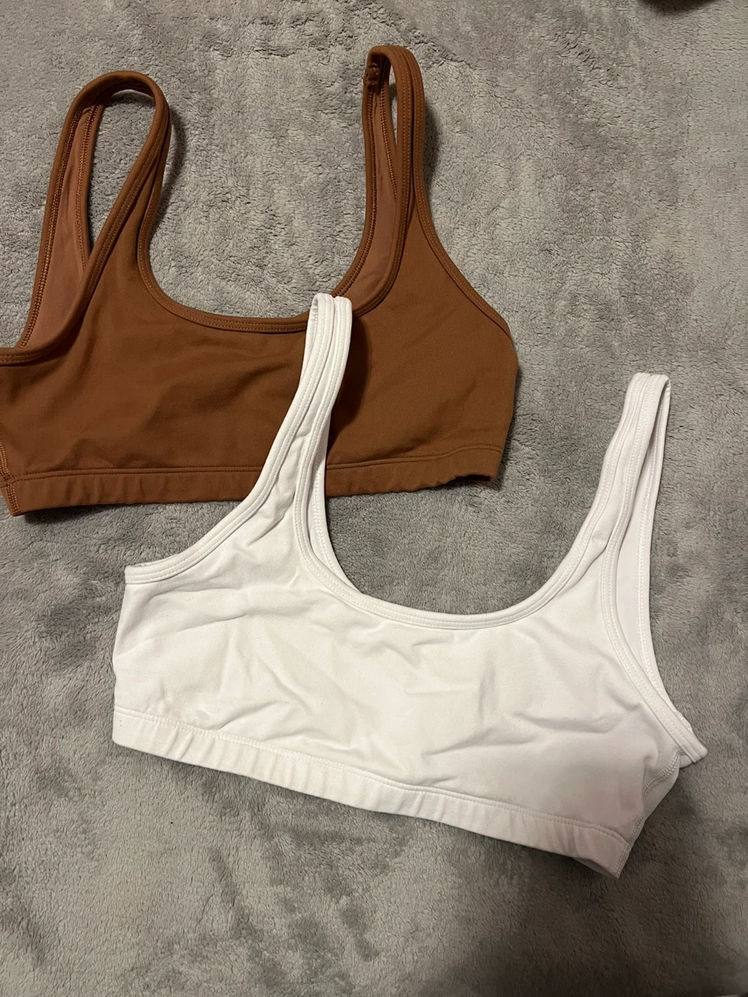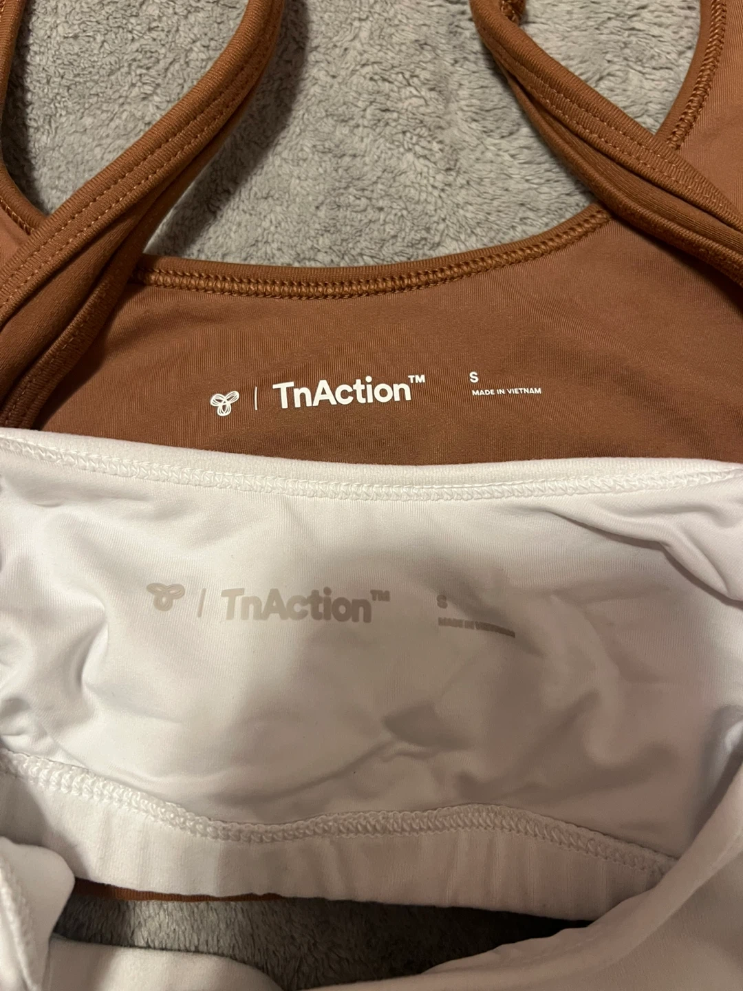 Two TnAction sports bras in great condition! One is a lovely brown colour, and the other is white. Both are size small.