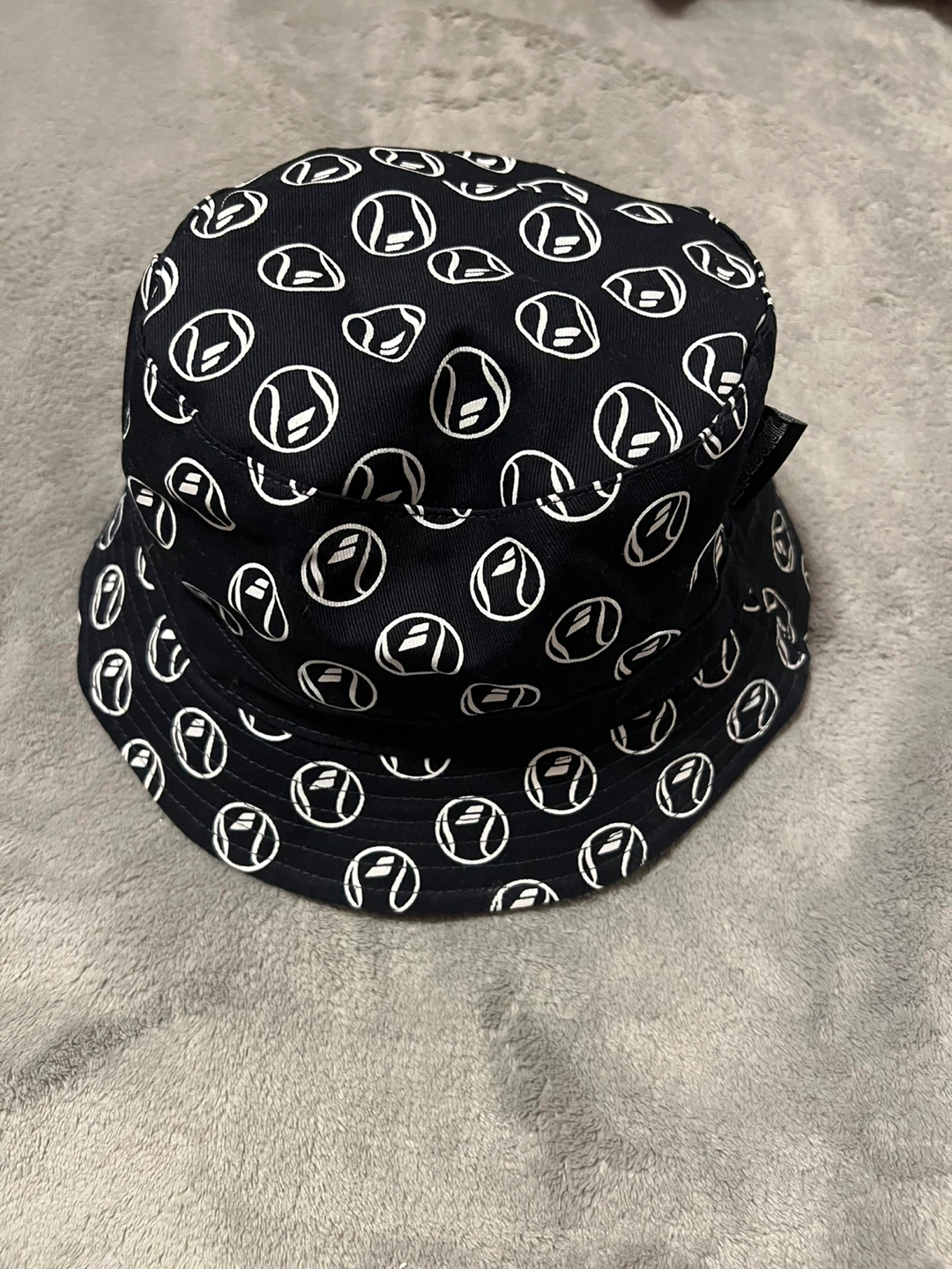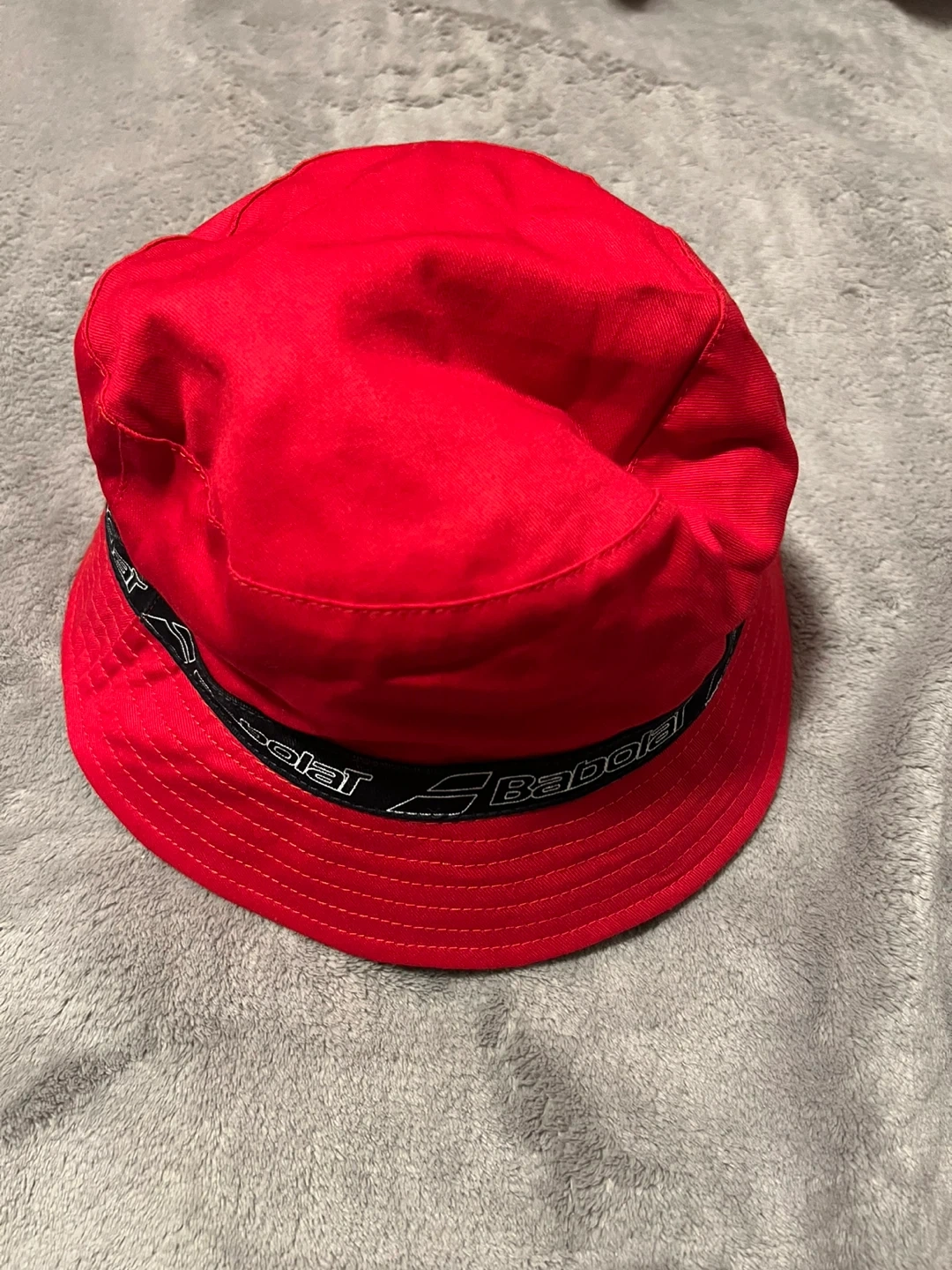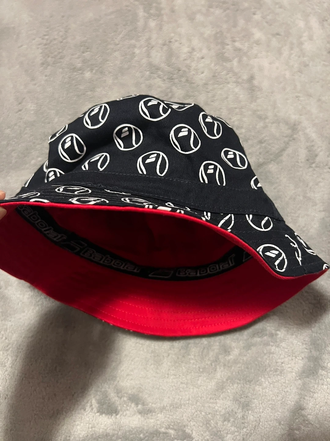 Babolat bucket hat with a cool design! It's black on the outside with the Babolat logo pattern and red on the inside