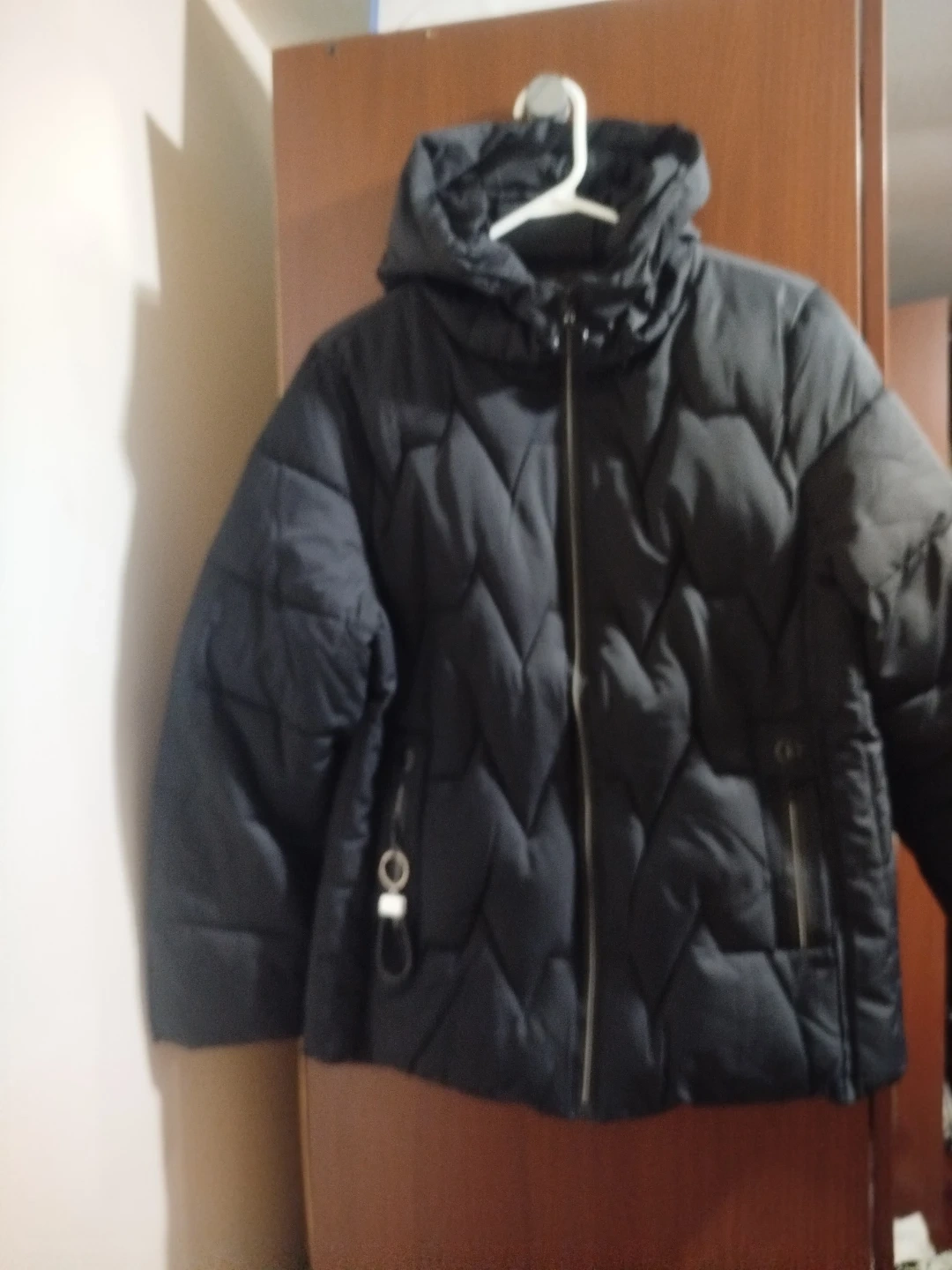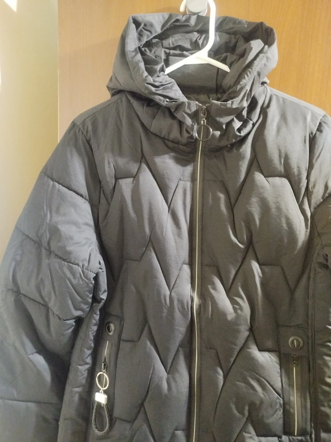 Here's a cozy black puffer jacket! It's in great condition and perfect for staying warm during the colder months. The jacket features a hood and a zipper closure, plus some handy pockets
