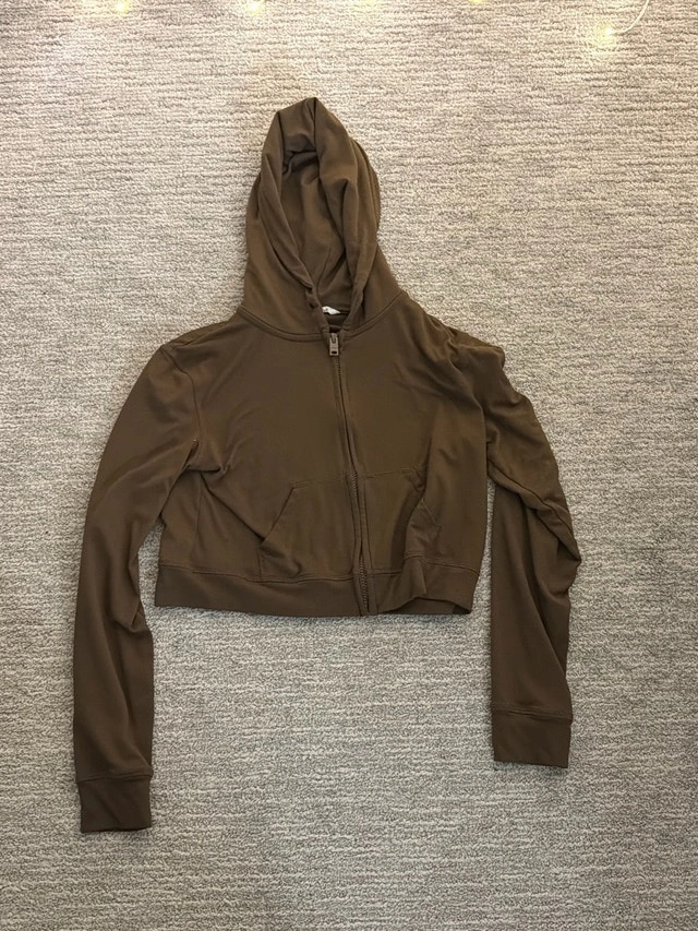 This is a used Brandy Melville cropped hoodie, perfect for layering or wearing on its own, with a full zipper and front pockets. It's in good condition, showing some signs of wear but plenty of life left.