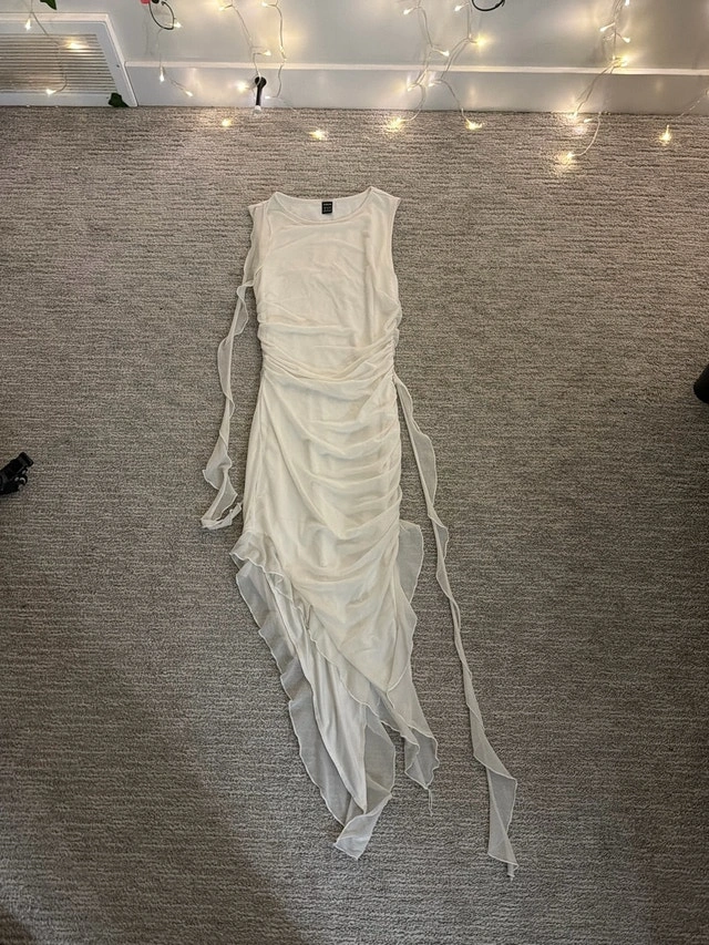 This Shein white dress is perfect for a night out. The dress is in used-good condition and has an asymmetrical hem with a side tie.