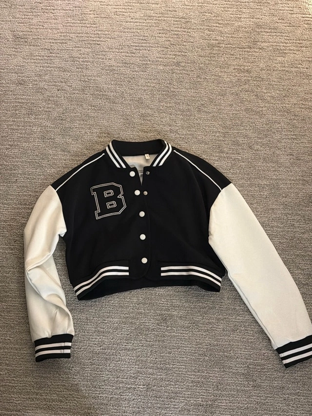 This stylish varsity jacket features a classic black and white design, making it a trendy addition to any wardrobe. It's in good used condition, showing only slight signs of wear. Perfect for adding a sporty touch to your everyday look! * Classic varsity style * Black and white colour scheme Ready to give this cool jacket a new home! Don't be shy, if you see this ad, it's still up for grabs!