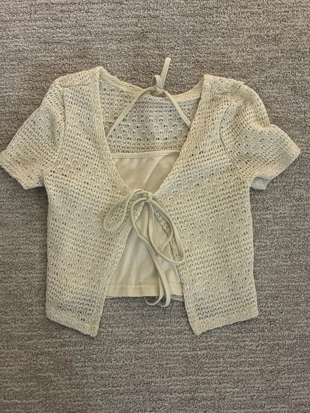 Cute, used crochet crop top features a tie front and back, perfect for layering or wearing on its own during warmer weather. The open knit design adds a touch of boho-chic to any outfit. It's in good condition. Let me know if you're interested!