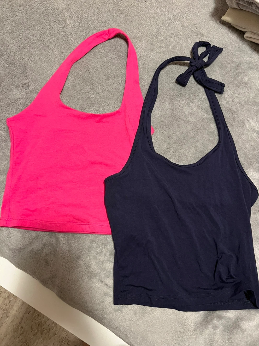 Two cute halter tops for sale! One is a vibrant pink and the other is a dark navy blue. Both are size small. They're in great condition and ready for a new owner