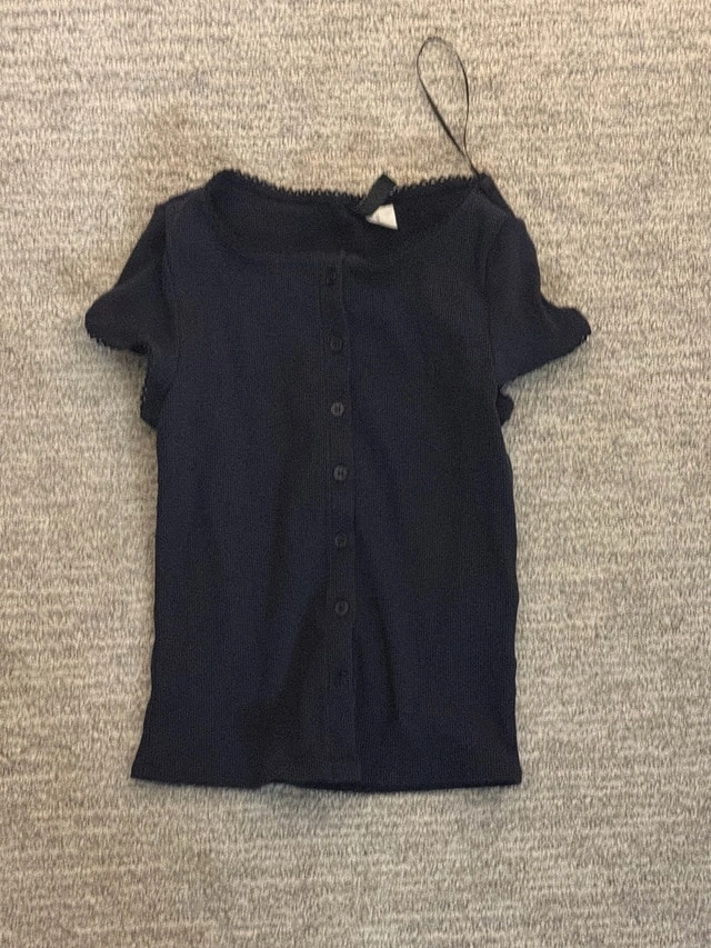 This is a gently worn H&M navy blue top, perfect for casual wear, featuring a button-down style and short sleeves.