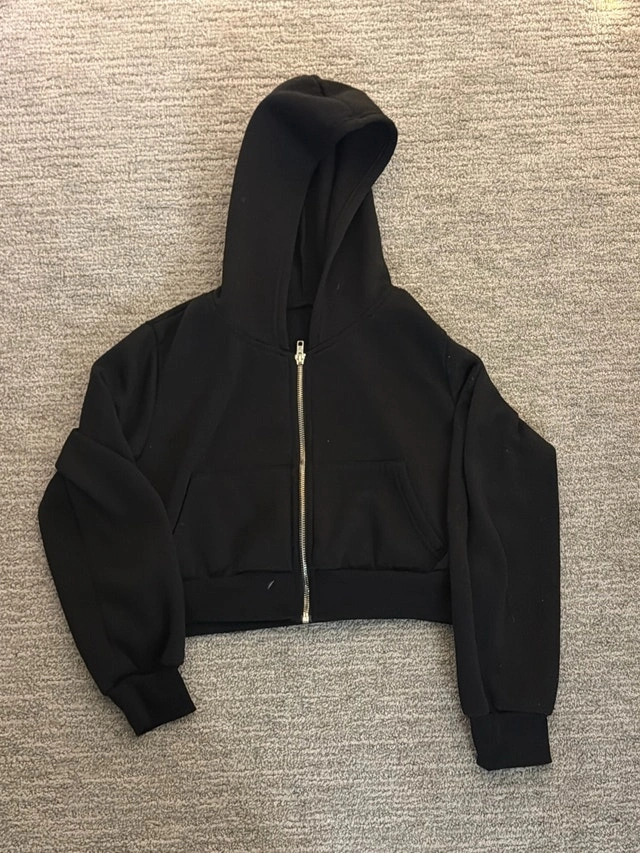 This is a stylish black hoodie featuring a full zipper and a comfortable, slightly cropped fit. It's in good condition, perfect for layering or wearing on its own, offering both style and practicality.