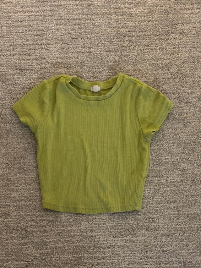 Add a pop of colour to your wardrobe with this trendy, used green crop top featuring a comfortable knit texture and a flattering, short-sleeved design. It’s perfect for casual outings or layering. * Ribbed Knit * Short Sleeve * Cropped Length This top is ready for its next adventure!
