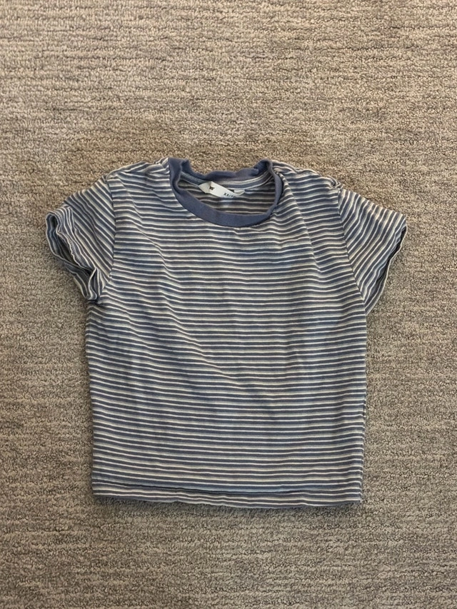 This is a Wilfred Free T-shirt with blue and white stripes in a size small. This T-shirt is in good condition, showing that it has been previously worn but well-maintained. It’s a super cute T-shirt that will be a great addition to your wardrobe. Details: - Brand: Wilfred Free - Size: Small - Colour: Blue/White Striped - Condition: Good