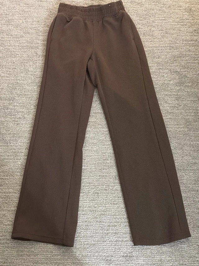 These are comfortable brown pants with a wide leg and a ribbed texture, perfect for lounging or casual wear. The pants are in used condition, but still have lots of life left in them! These pants are so versatile; wear them to the gym, wear them to the grocery store, or even just around the house! If this ad is still up, they're still available!