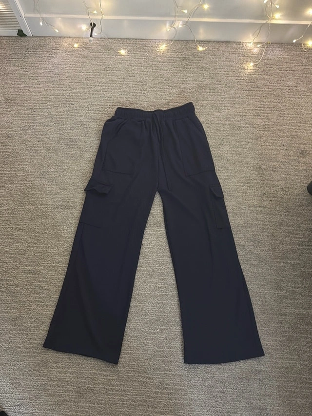 These are gently worn, but still in great condition cargo pants, perfect for a casual and comfortable look. They feature a relaxed fit with a drawstring waist and wide legs.