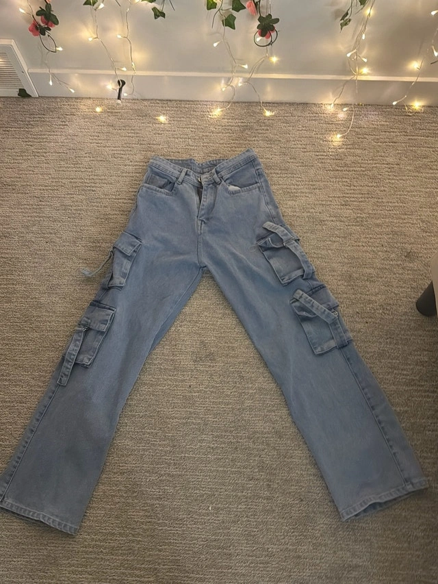 I'm selling these trendy, used light wash denim cargo pants, perfect for adding a stylish and functional edge to your wardrobe. These pants feature multiple pockets and a comfortable fit, making them ideal for everyday wear. There may be slight signs of wear but these are in good condition. Here are some details: * Light wash denim * Multiple cargo pockets * Comfortable fit * Size: M