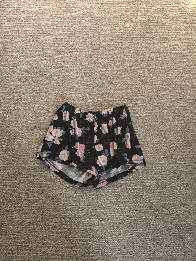 These are a stylish and comfortable pair of floral shorts, perfect for lounging or casual wear, and in good condition. The shorts feature a black background with a pattern of pink and white flowers, offering a cute and trendy look. The elastic waistband ensures a flexible and comfortable fit for various body types. Since this item is in good condition, I'm offering it at a reasonable price. If you are seeing this ad, rest assured, these floral wonders are still waiting to bloom in your wardrobe!