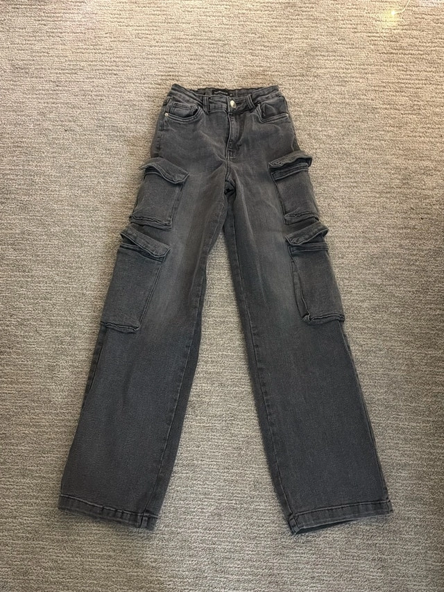 Add some edge to your wardrobe with these Garage grey denim cargo pants! These stylish and functional pants feature a comfortable fit and multiple pockets, perfect for carrying your essentials while making a statement. They are in good, used condition.