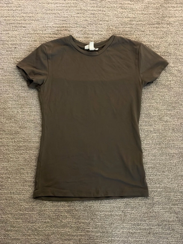 This is a H&M olive green T-shirt, perfect for casual wear, with a comfortable fit. The T-shirt is in good condition, with no visible signs of wear. Here are the details: