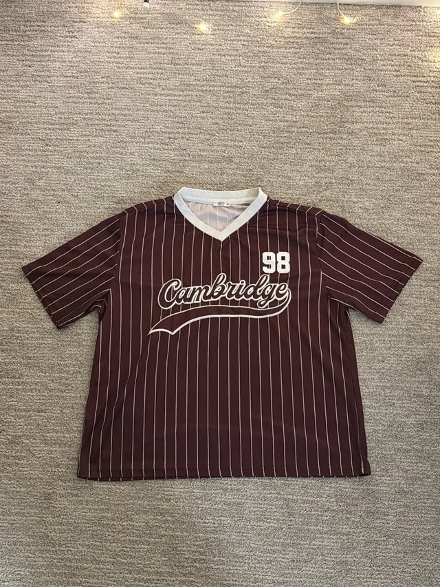 Add a touch of sporty flair to your wardrobe with this pre-owned Cambridge pinstripe shirt, featuring a stylish V-neck and short sleeves. In good condition, this shirt is perfect for casual outings or adding a retro vibe to your look. Key Features: - Brand: Cambridge - Design: Pinstripe with "Cambridge 98" graphic - Neckline: V-neck - Sleeves: Short sleeves - Condition: Gently used Priced to sell at $10!