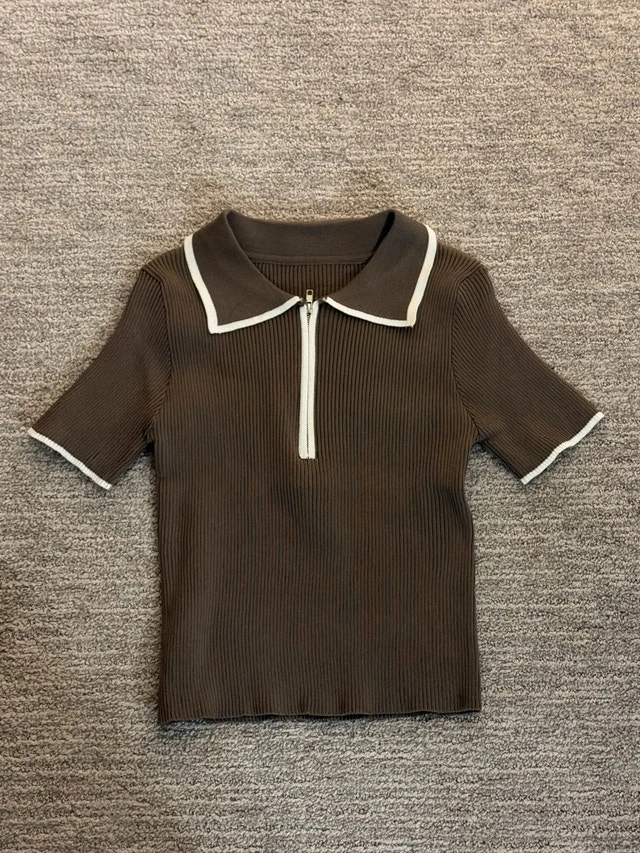 This is a fitted, brown, short-sleeved t-shirt with a zipper and a white trim. This pre-owned t-shirt is in excellent condition. It is a stylish, fitted top with a sporty feel. - Colour: Brown with white trim - Sleeve Length: Short sleeve - Fit: Fitted Adding this T-shirt to your wardrobe is like adding a sprinkle of fashion fairy dust – it’s bound to bring a little magic to your everyday style! If the ad is still up, the item is available!