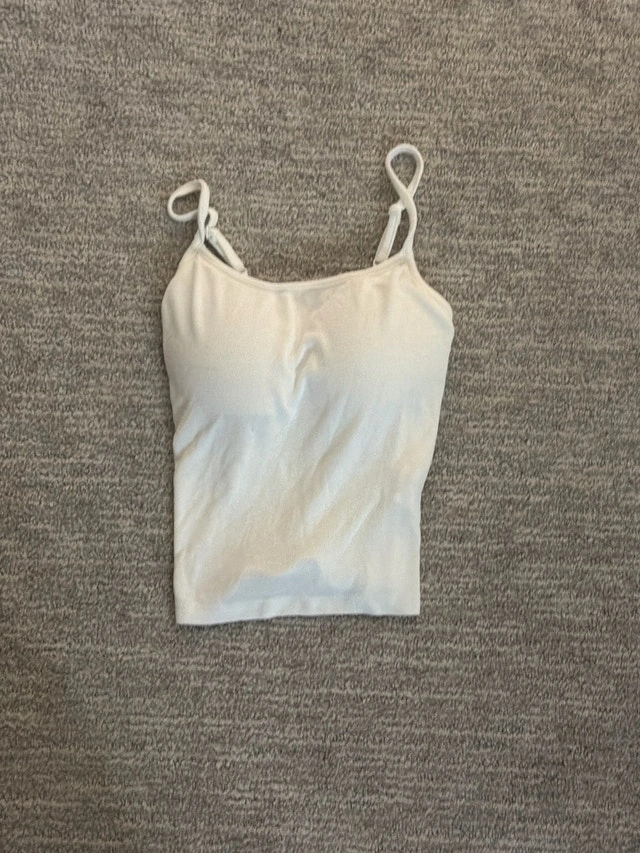 This is a used white tank top that is ideal for layering or wearing on its own, featuring a comfortable and breathable fabric. While it has been worn, it remains in good condition and ready for a new home. If the ad is up, it is available.