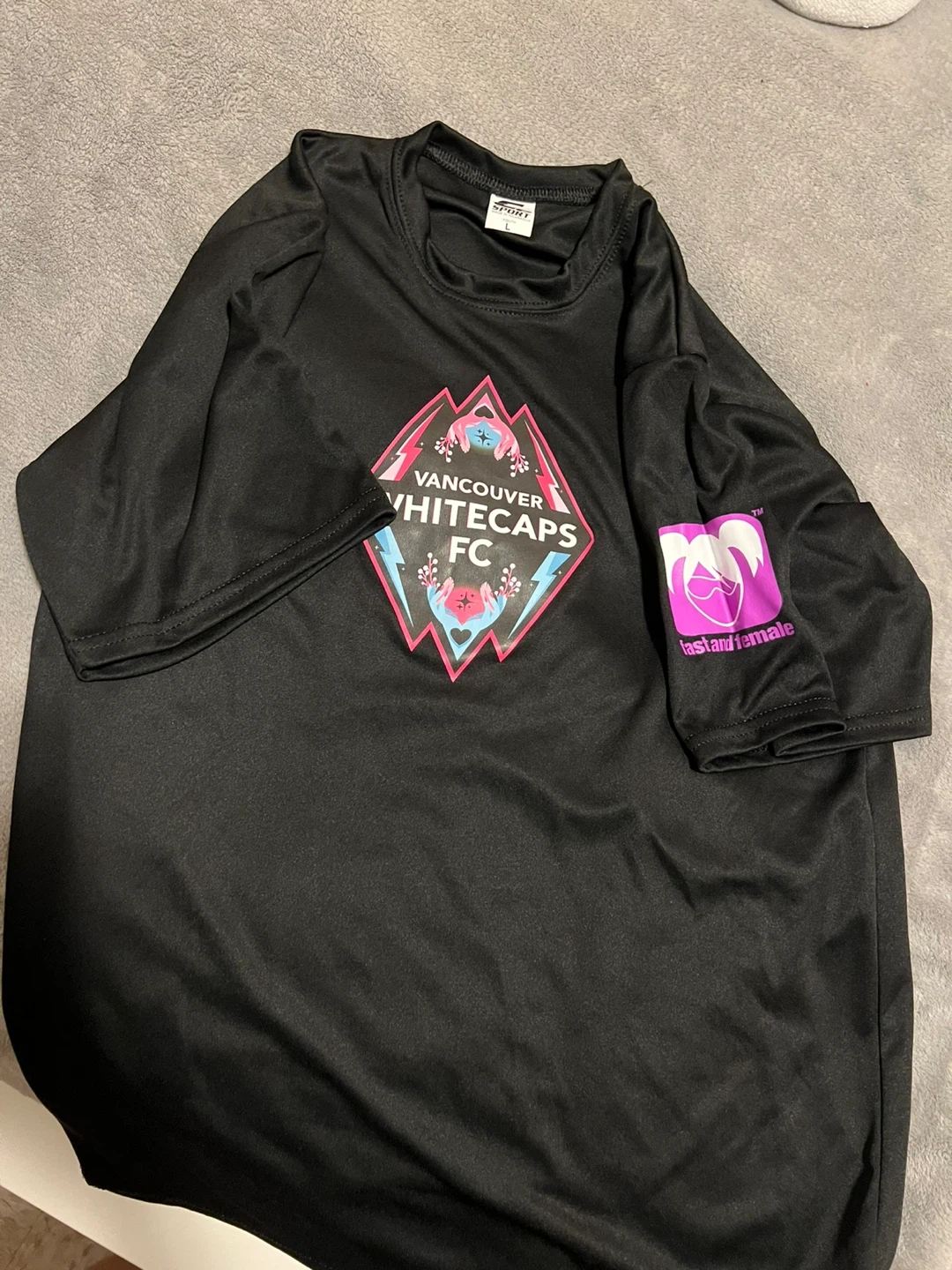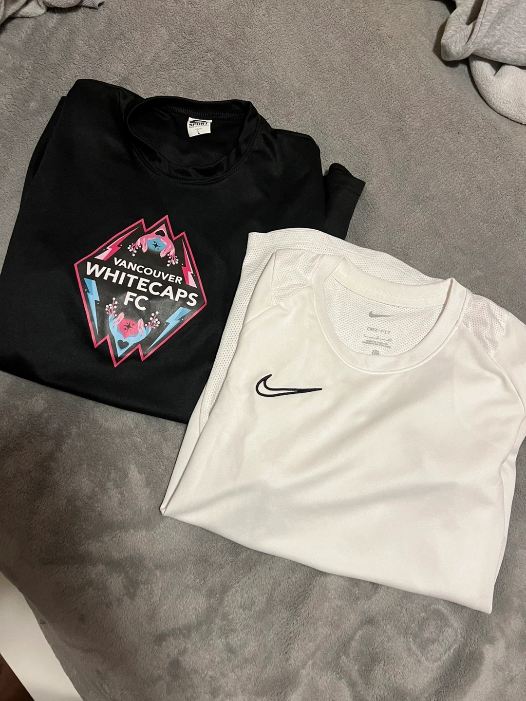 Selling two soccer shirts. One is a white Nike shirt and the other is a black Vancouver Whitecaps FC shirt. Both are in great condition and ready for a new player!
