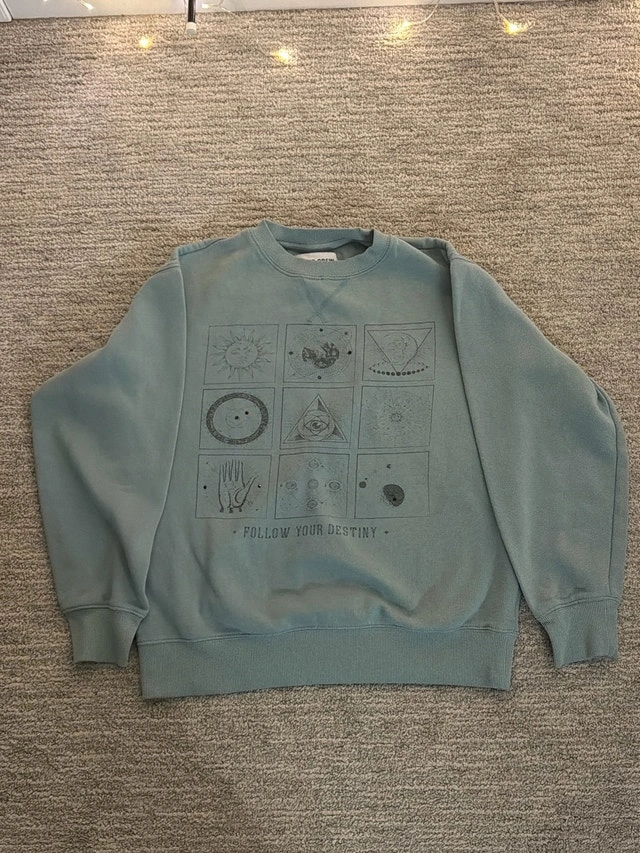 This is a sage-green sweatshirt with a unique, mystical design printed on the front. This is a used item, showing some signs of wear but still in good condition. Let me know if you're interested!