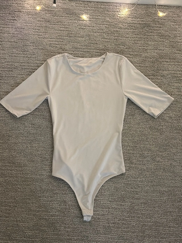 This is a white, short-sleeved bodysuit, perfect for layering or wearing on its own. It's in good condition, showing minimal signs of use, and has been carefully maintained. This bodysuit is a versatile addition to any wardrobe! Let me know if you're interested!