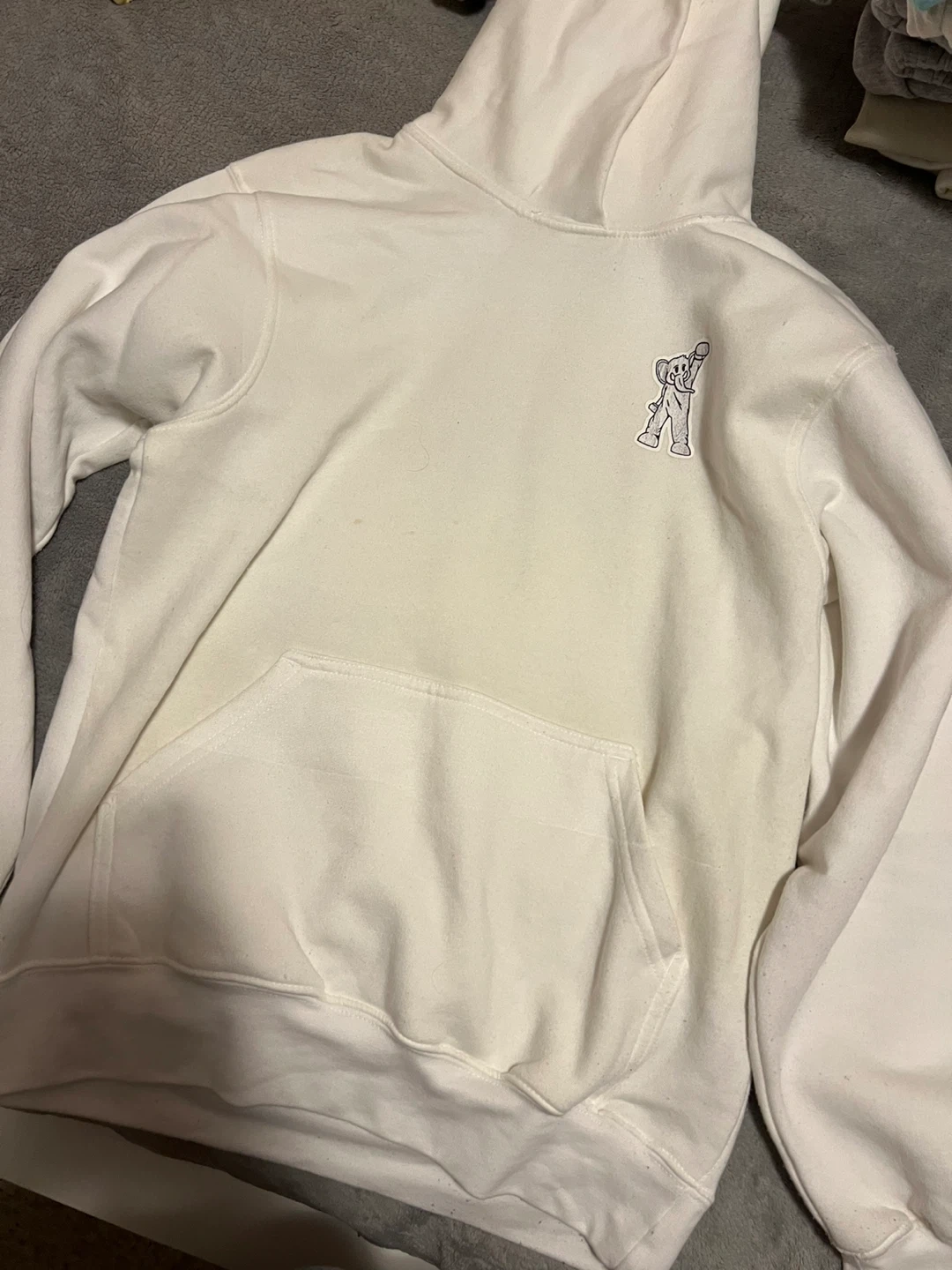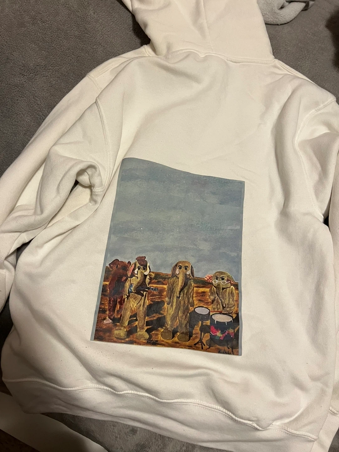 Selling a white hoodie with a unique graphic design on the back and a small design on the front. It's in good condition and is perfect for casual wear. Take a look at the pictures!