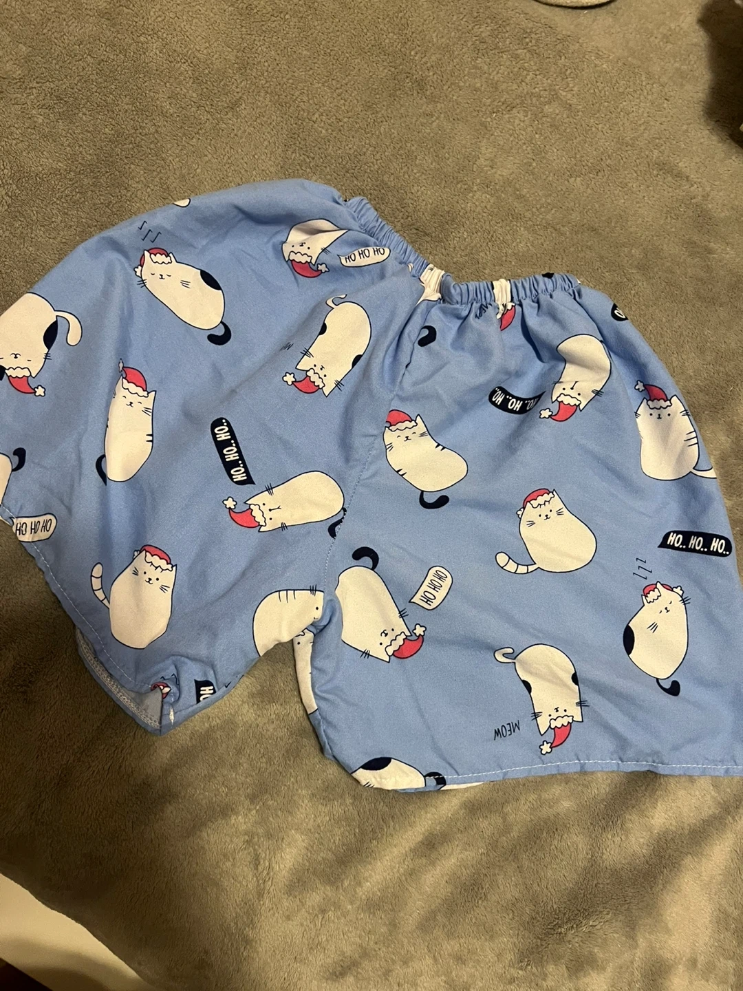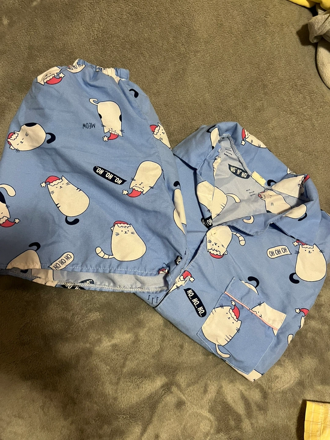 Cute cat print pajama set in blue! The set includes a button-up short-sleeved shirt and shorts. Perfect for a cozy night's sleep!