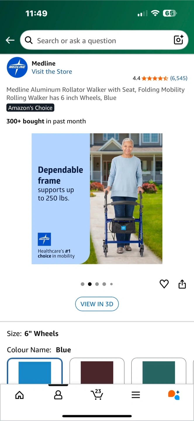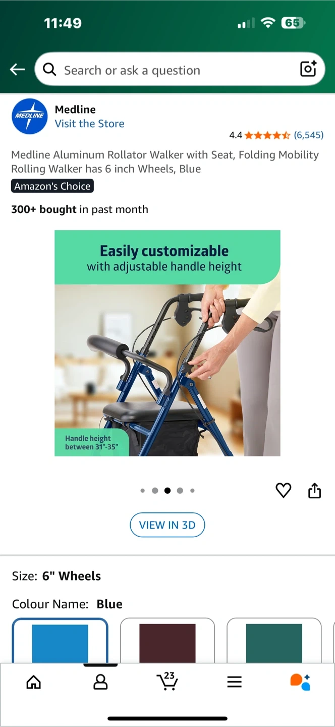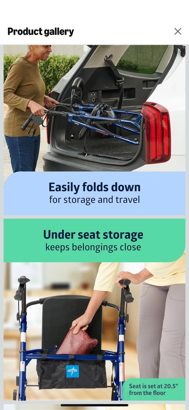 Selling a Medline aluminum rollator walker with a seat! It's a folding mobility rolling walker with 6-inch wheels. The colour is blue. It easily folds down for storage and travel. There's also under-seat storage to keep your belongings close by. The seat is set at 20.5" from the floor. The dependable frame supports up to 250 lbs. The handle height is easily customizable with adjustable handle height between 31"-35"