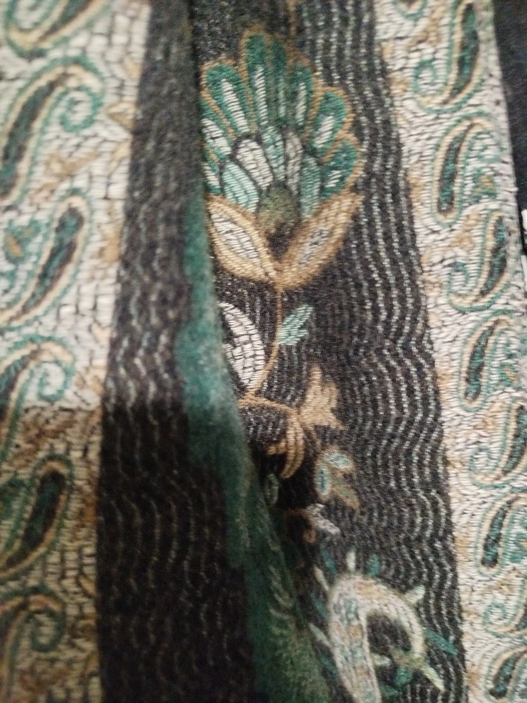 Here's a beautiful piece of the best wool shawl patterned. It features a floral design with paisley accents in shades of green, brown, and cream. Perfect for your next sewing or craft project!