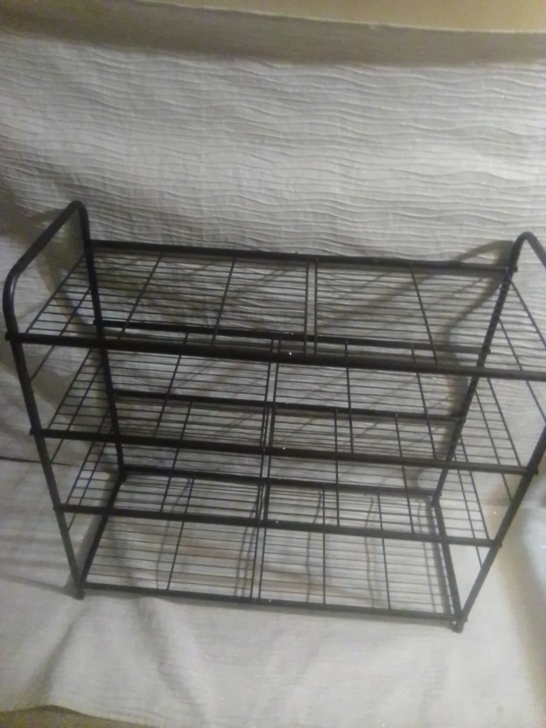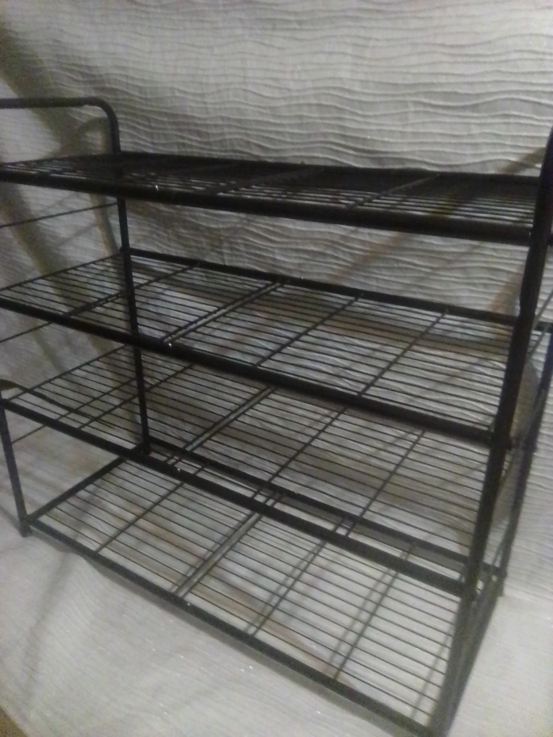 Here's a sturdy black metal shoe rack with four tiers! It's perfect for keeping your entryway or closet organized. It can hold several pairs of shoes and is in great condition