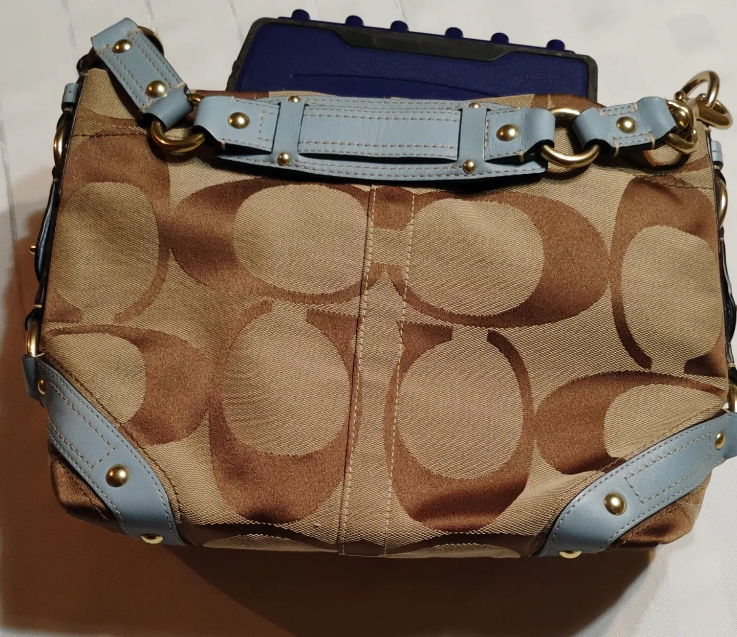 Selling a Coach Signature Demi Bag. It features the classic Coach logo pattern in brown and tan with light blue leather trim and gold hardware. It's in great condition and ready for a new owner!