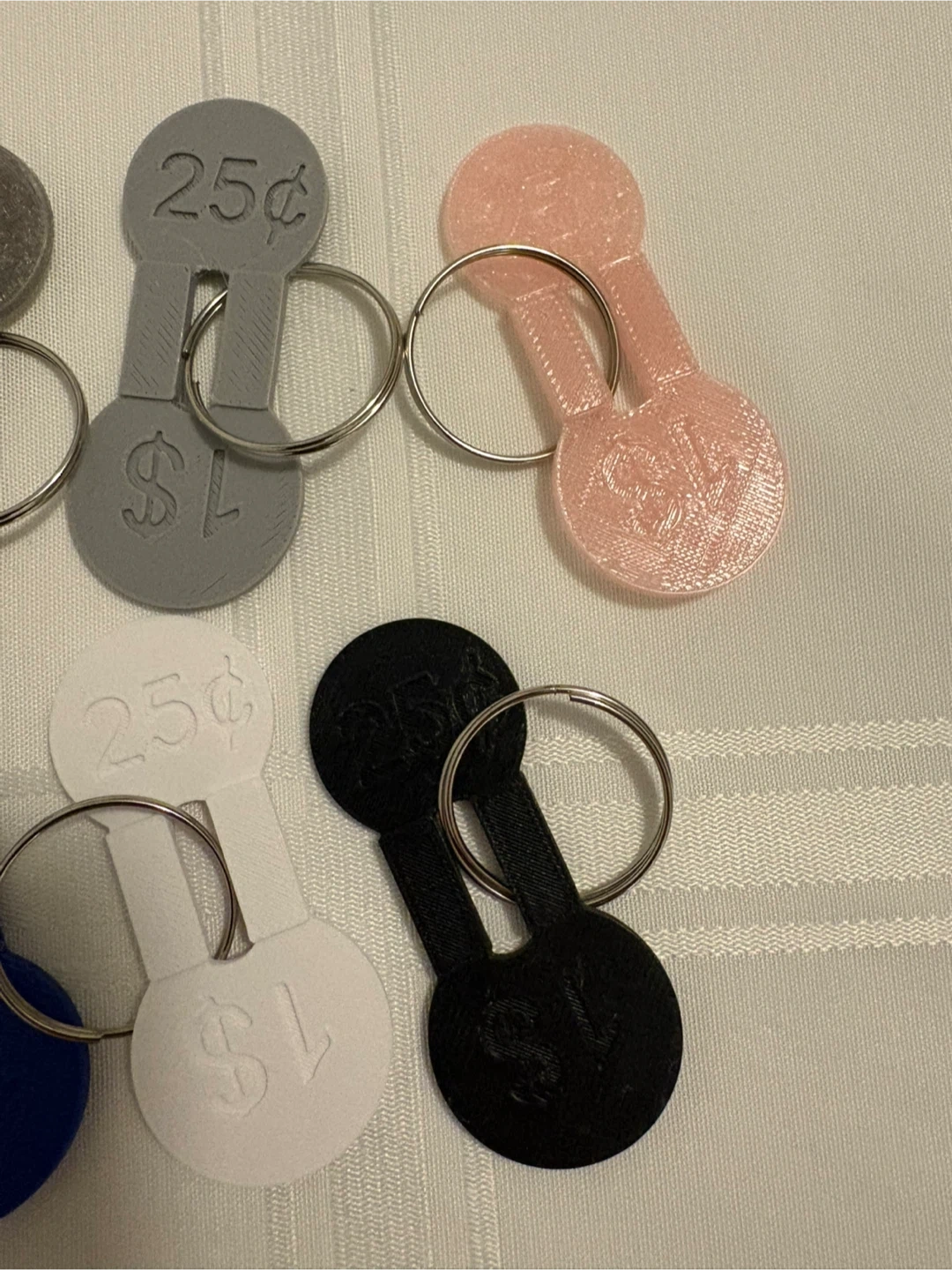 Selling these cute shopping cart coin keychains! They come in a variety of colours and are perfect for always having a quarter or loonie handy for the grocery store.