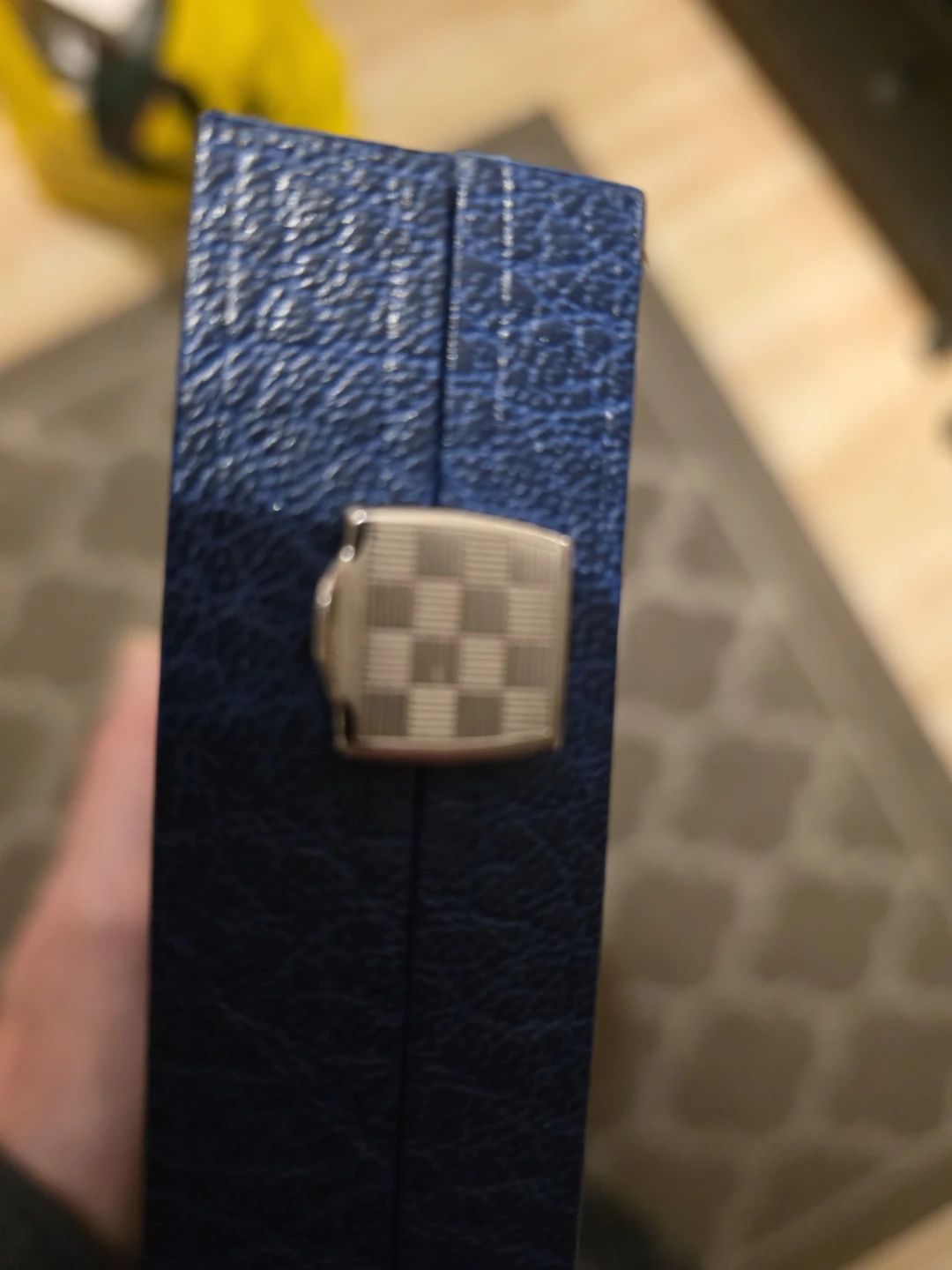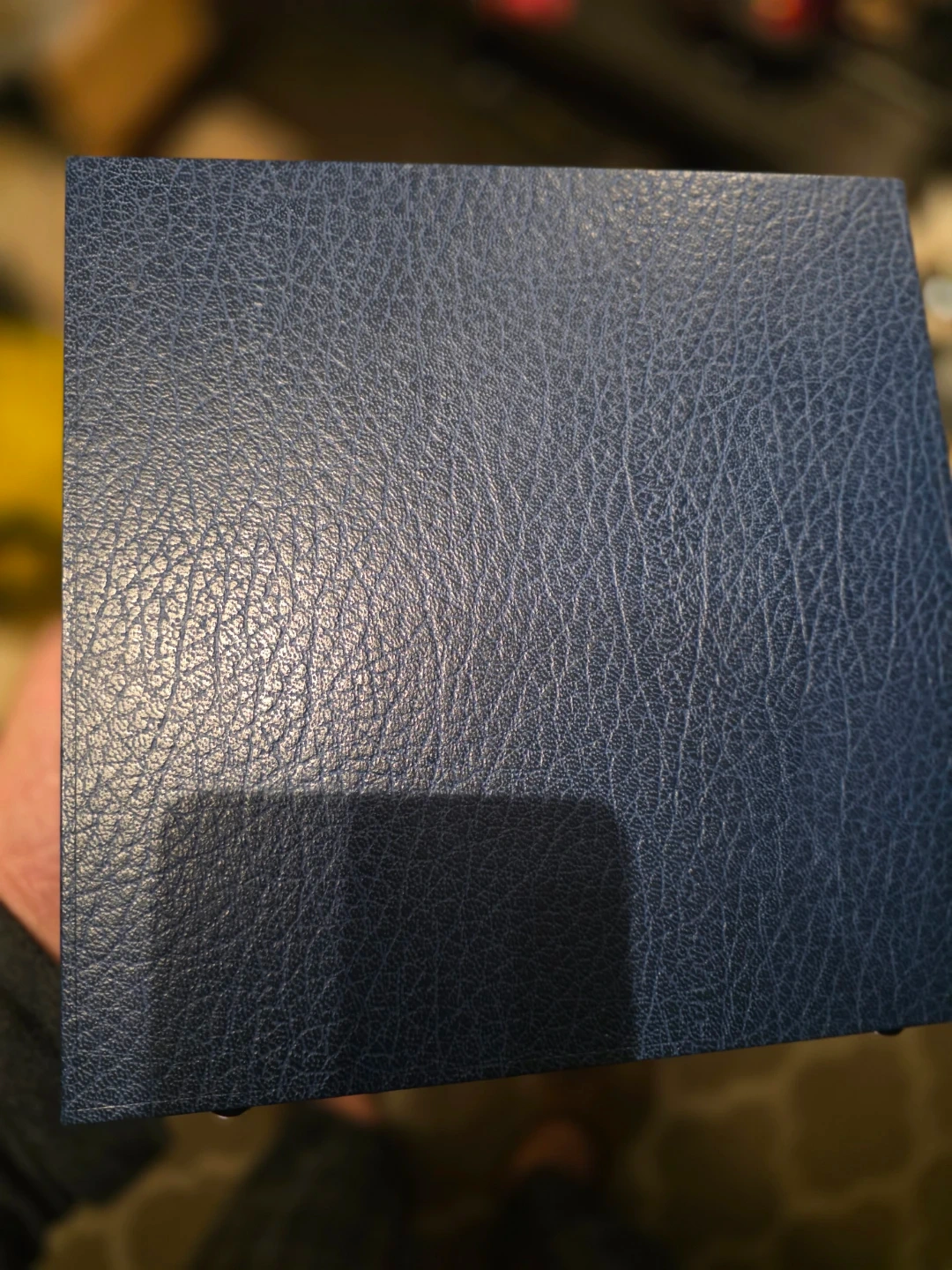 The exterior is a dark blue color, and the interior features a black velvet insert for the coins.