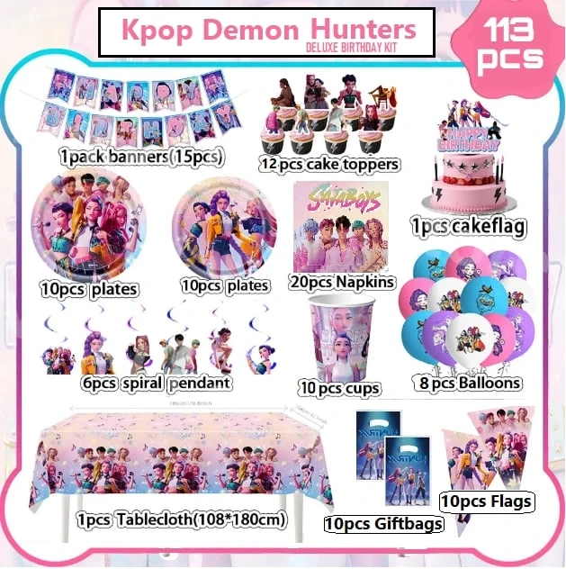 Get ready to party with this Kpop Demon Hunters deluxe birthday kit! It includes banners, cake toppers, plates, napkins, cups, balloons, a tablecloth, gift bags, flags, and a free piñata. Perfect for a themed birthday celebration!