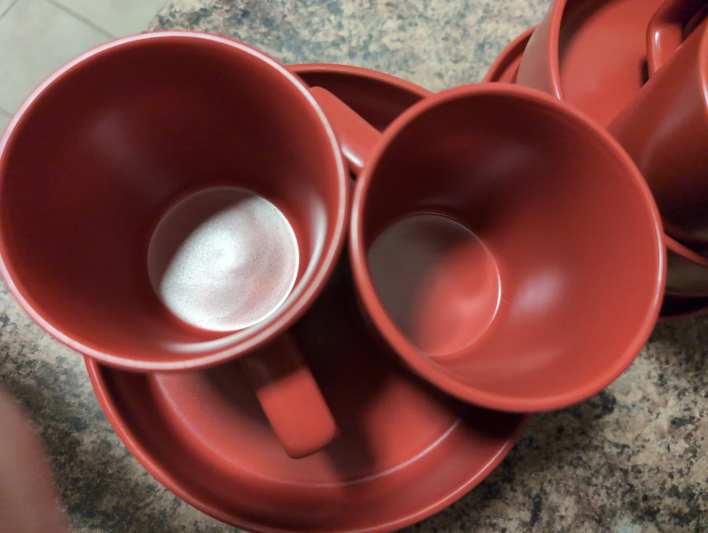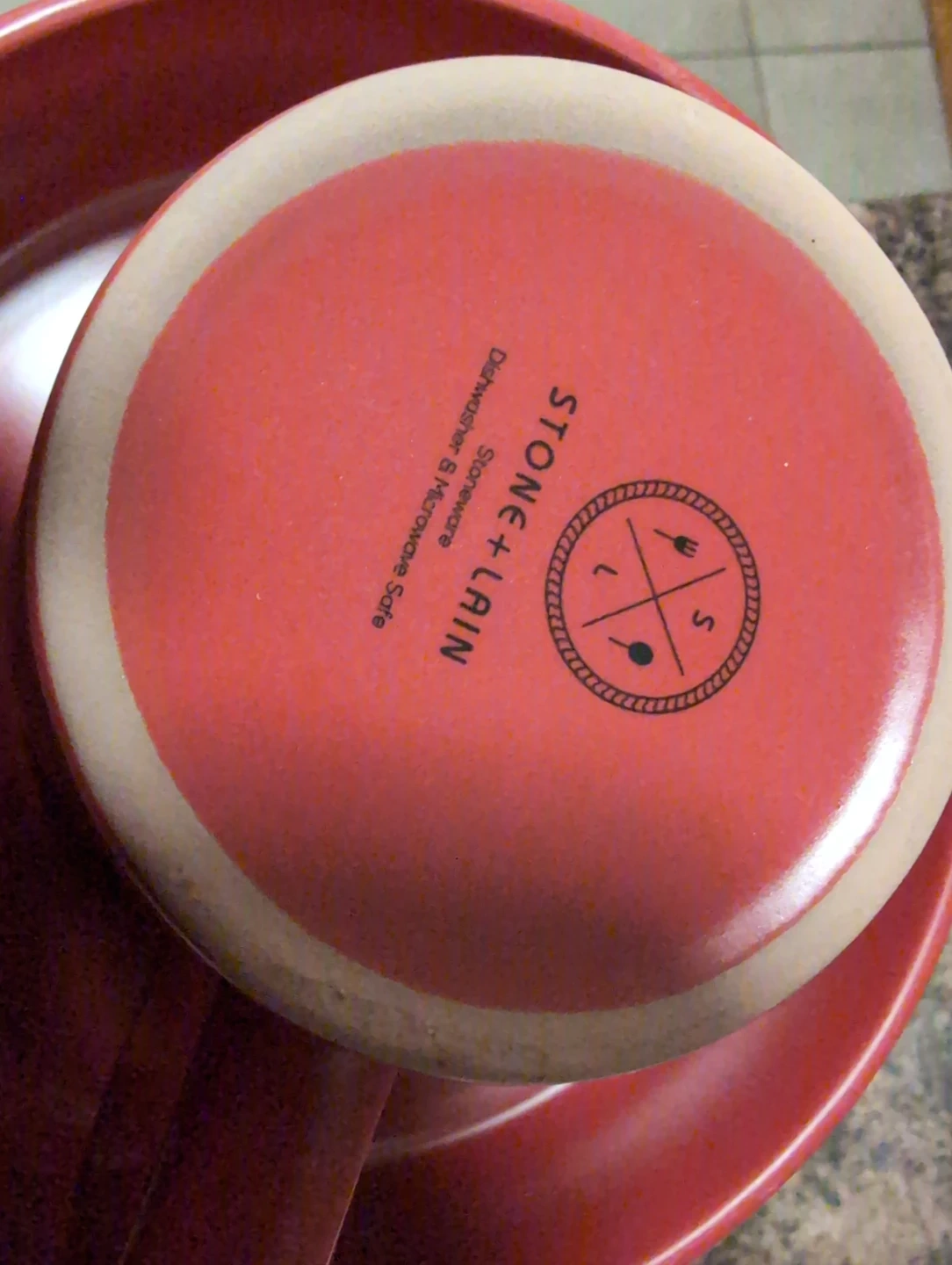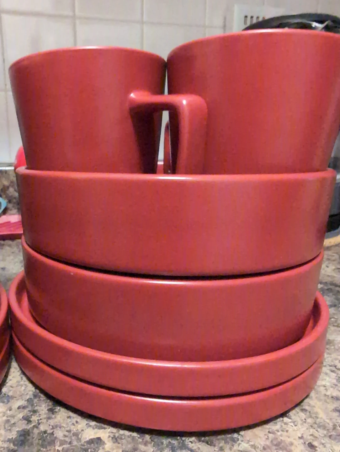A beautiful and great quality gently used Stone + Llain stoneware 12 pc dinner set in a lovely Cleo red colour!