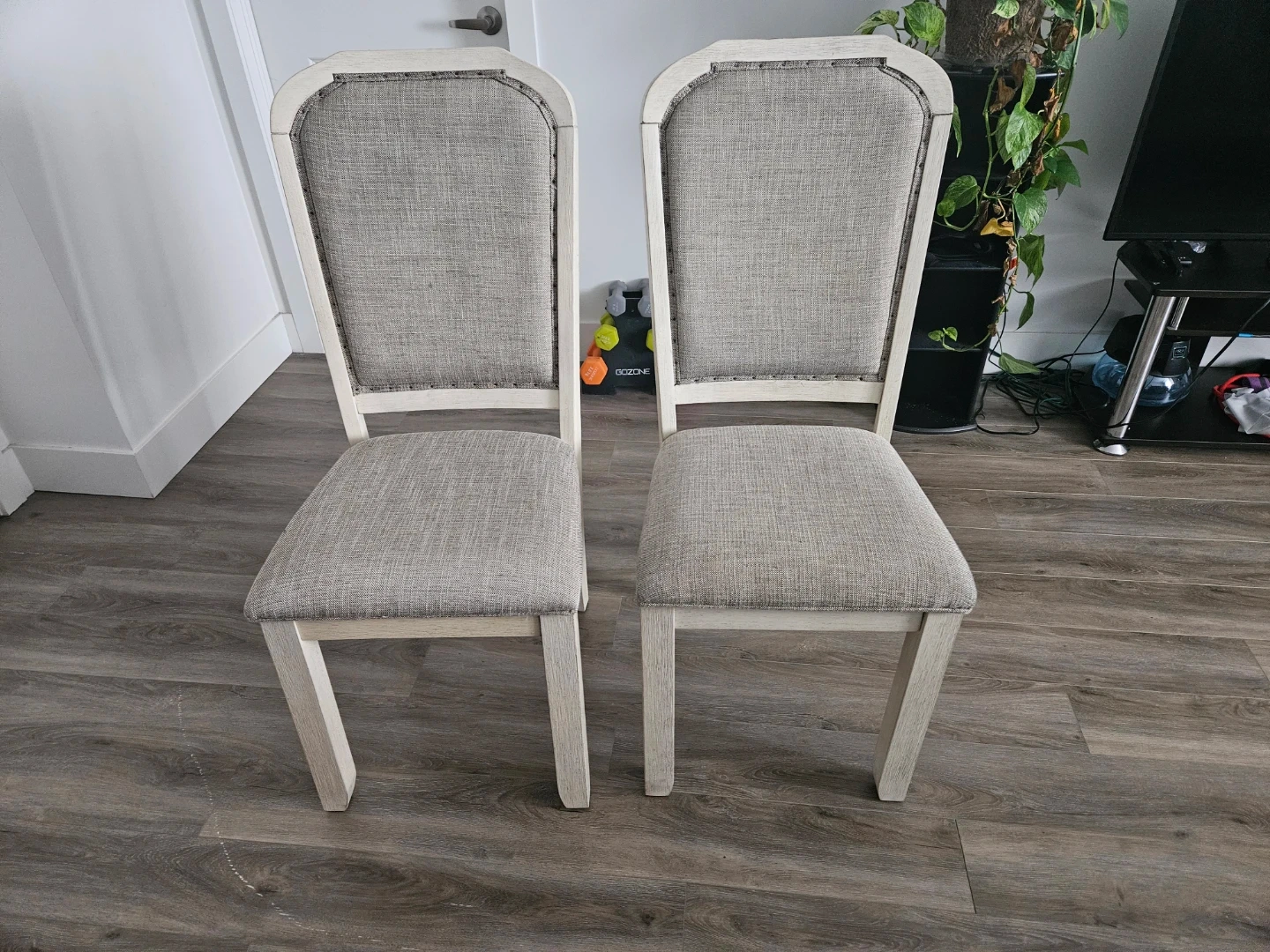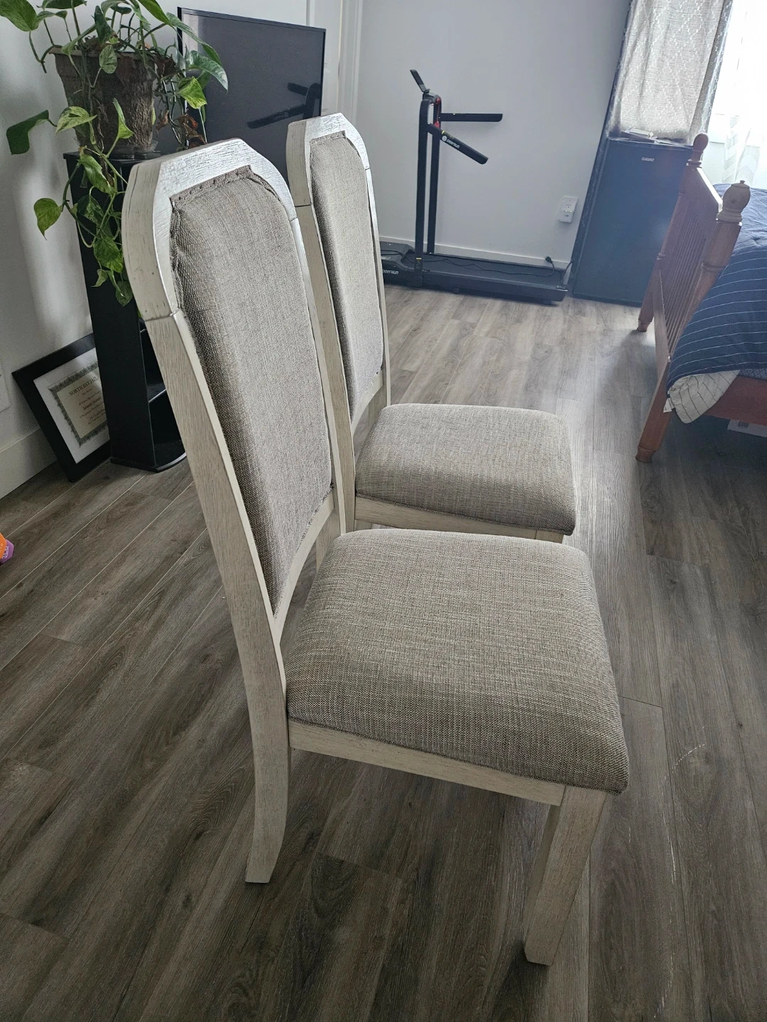 Selling a set of two dining chairs. They feature a neutral tone that would blend well with many decor styles. They're in great condition and ready to be part of your dining area!