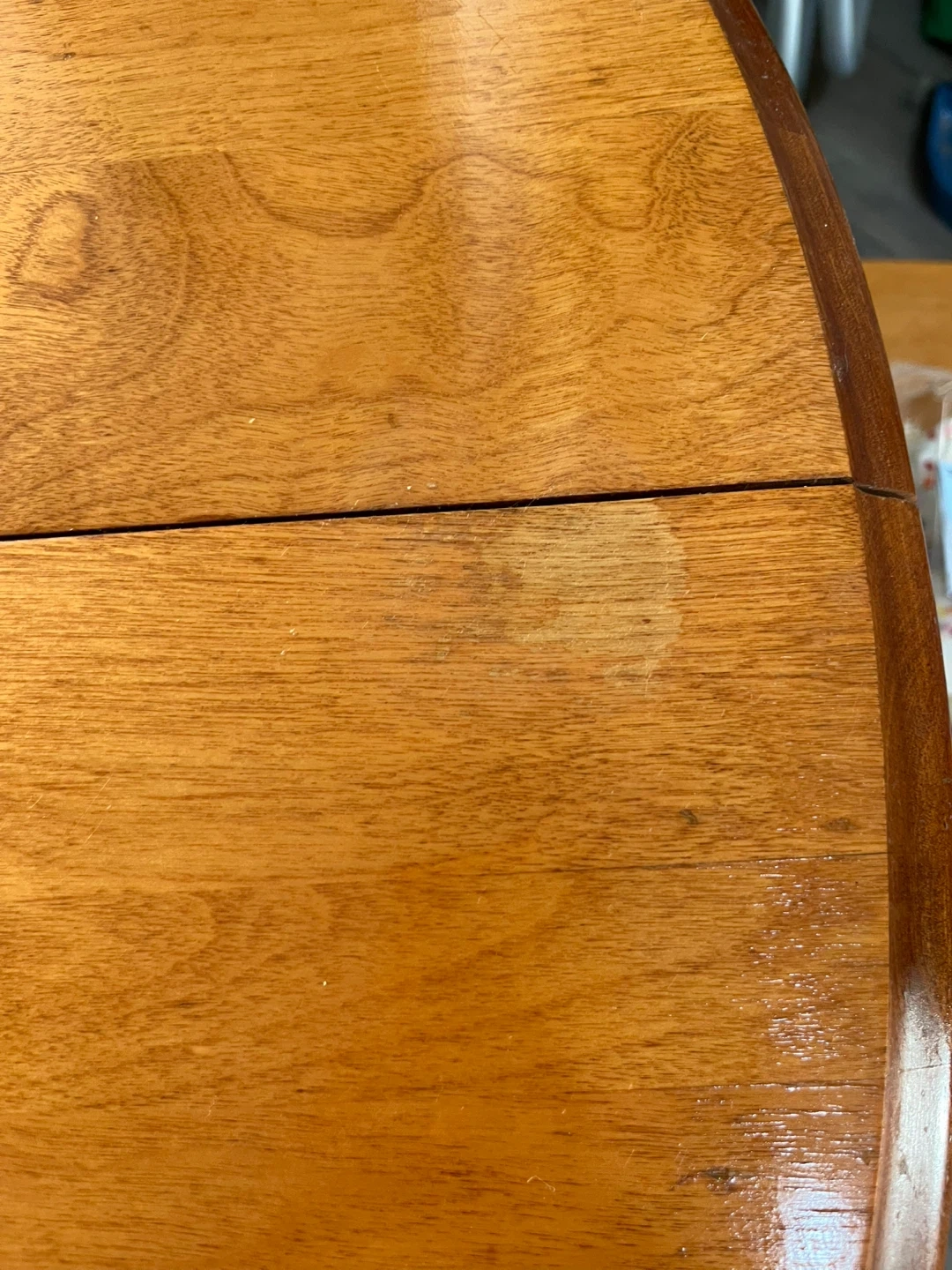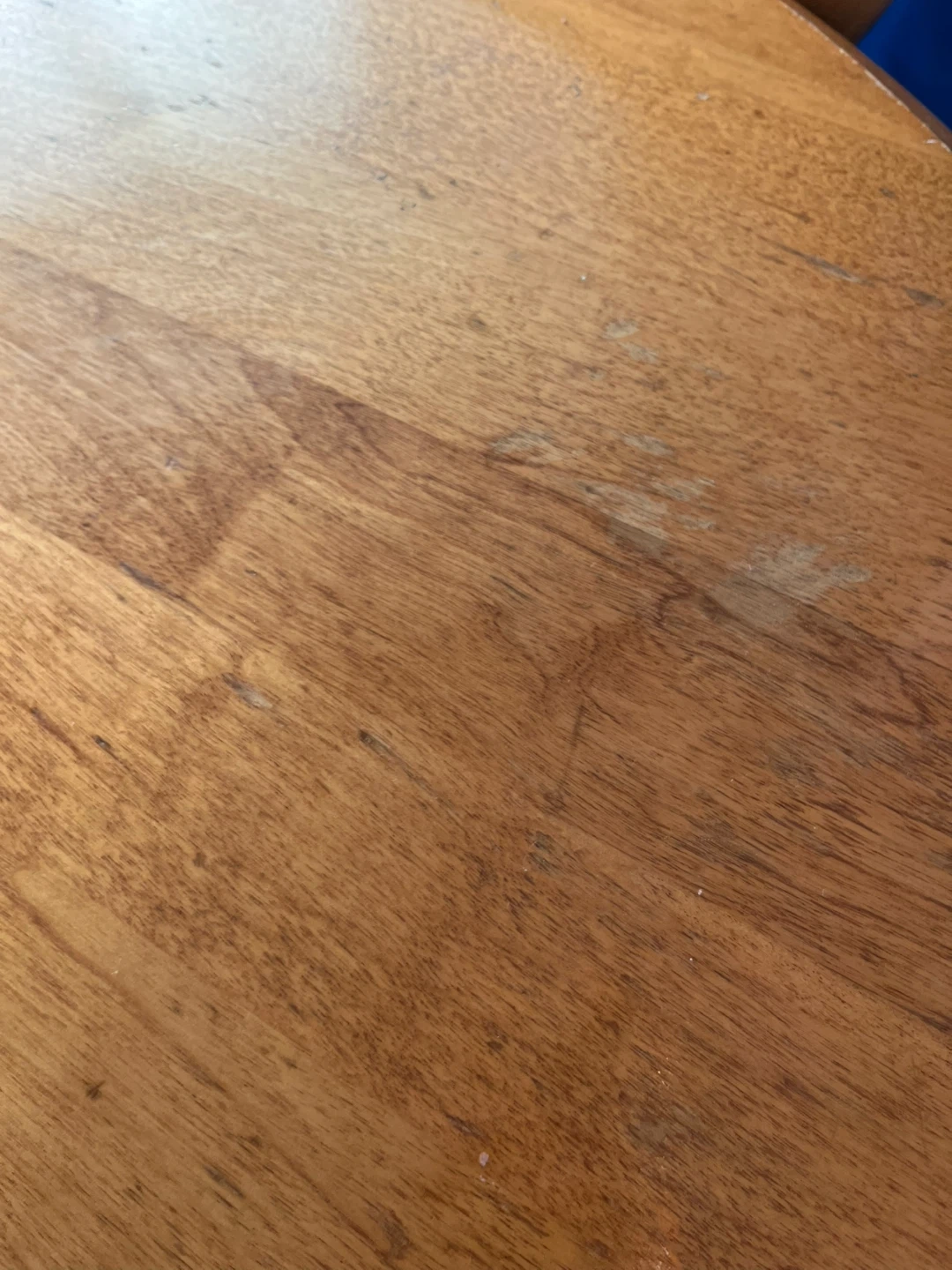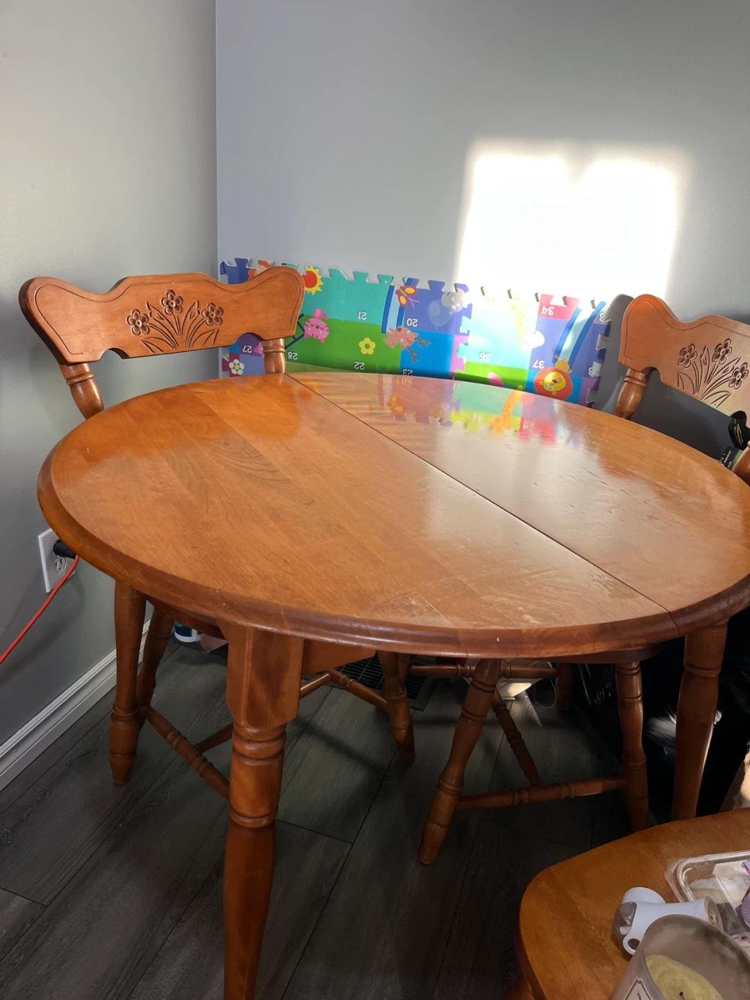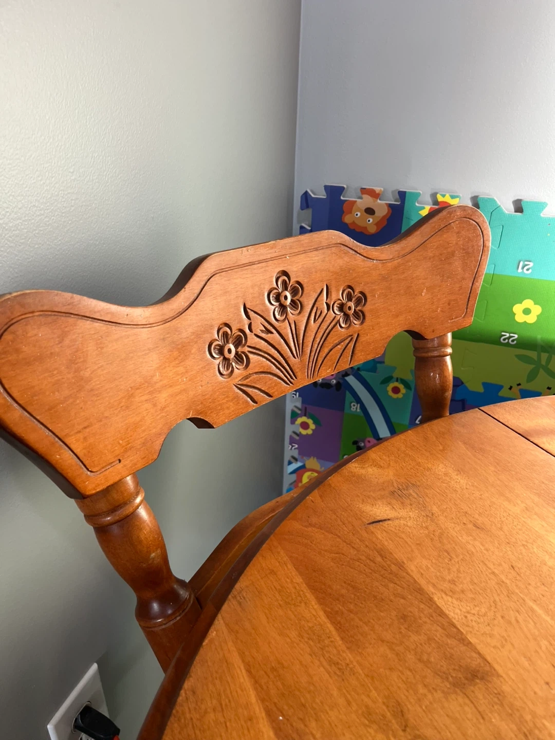 round wooden table with matching chairs! It has a classic design with flower carvings on the chair backs. There are some signs of use on the tabletop, but it's still a sturdy and functional set for your dining area or kitchen. Perfect for small spaces even.