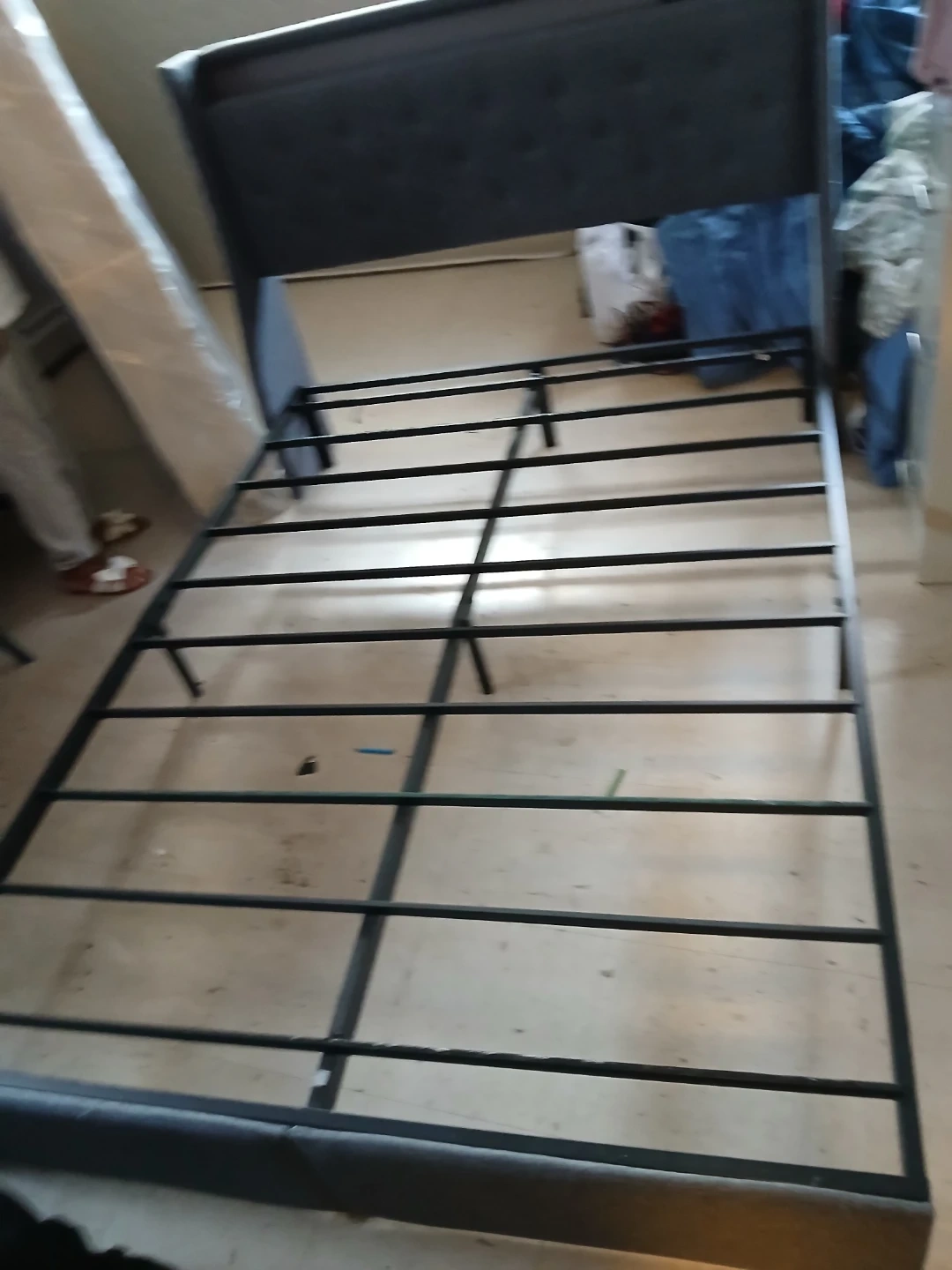 Selling a queen-size upholstered platform bed frame. It's in great condition and ready for a new mattress! The frame features a sleek, modern design with a dark gray upholstered finish.