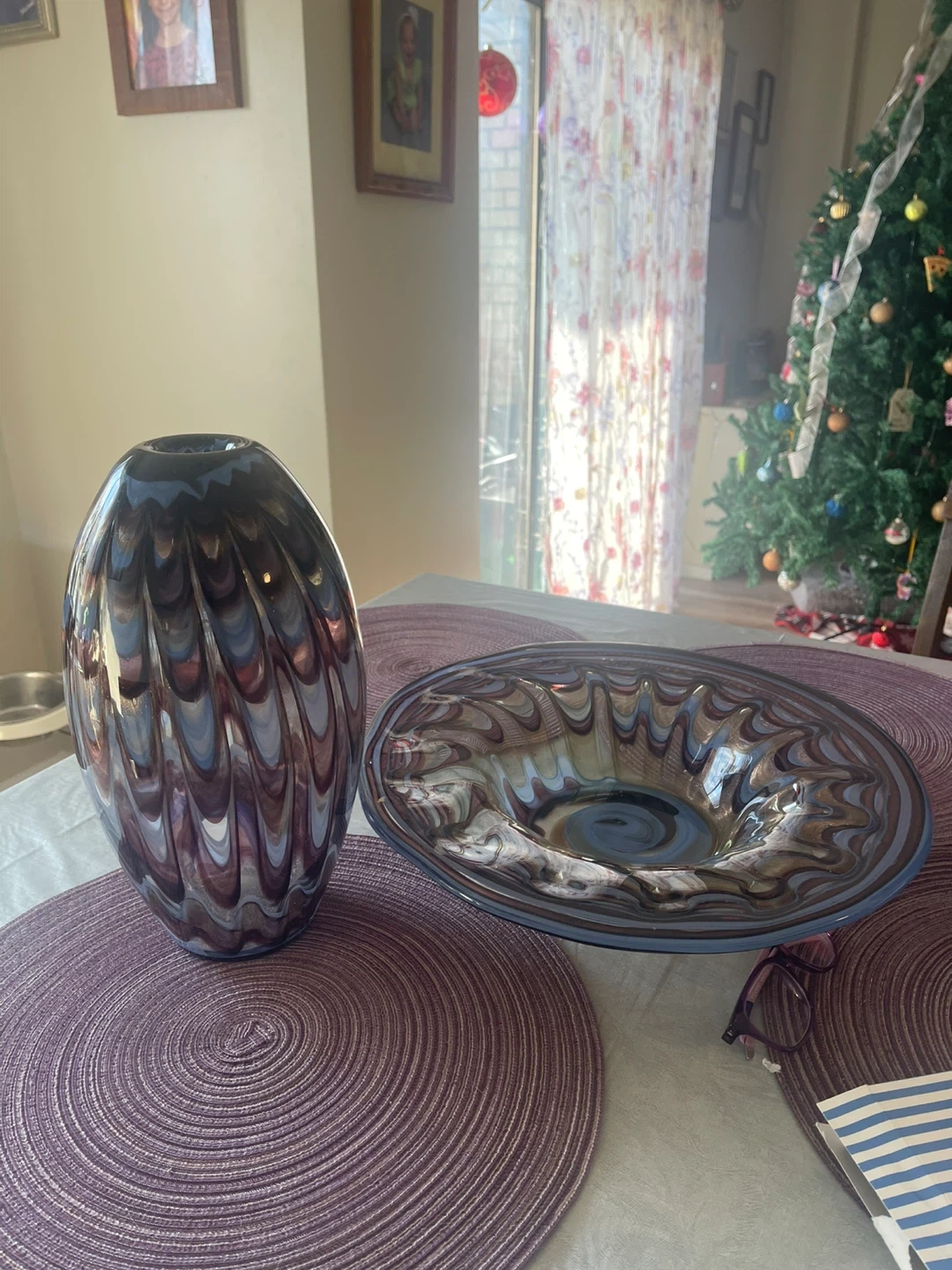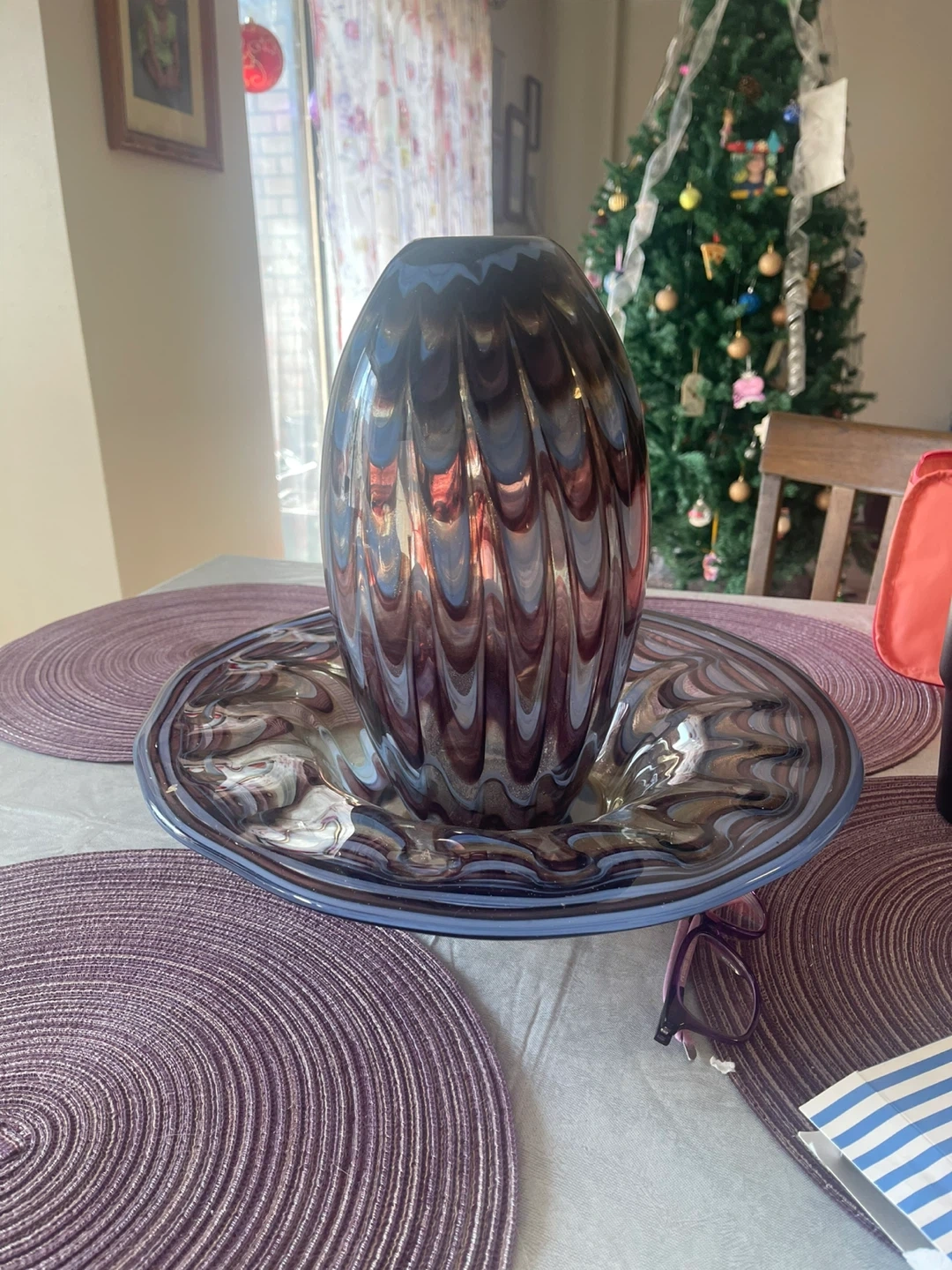 Beautiful Murano art glass vase and bowl set! The set features a unique swirl pattern in shades of blue, brown, and white. The vase is oval-shaped, and the bowl complements it perfectly. This set would make a stunning centerpiece or addition to any art glass collection