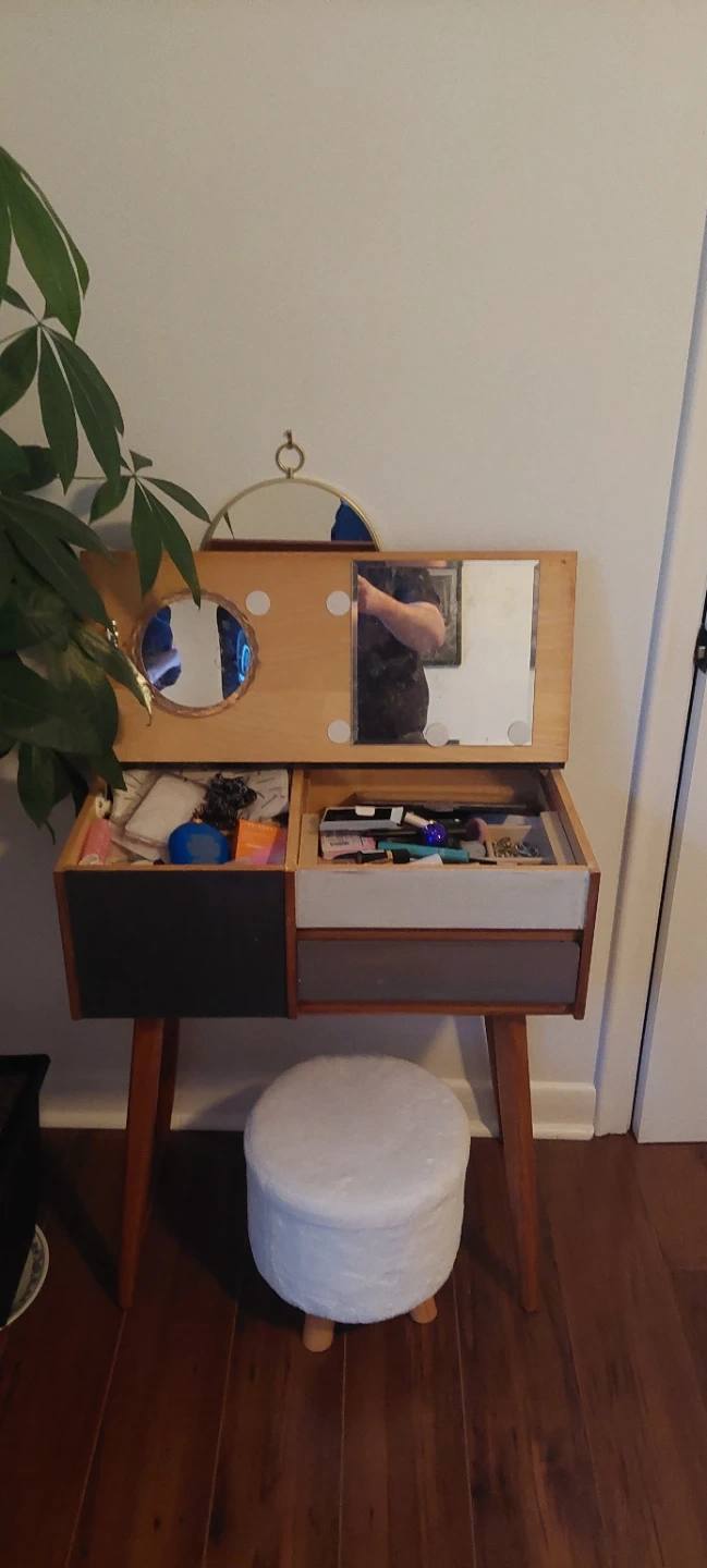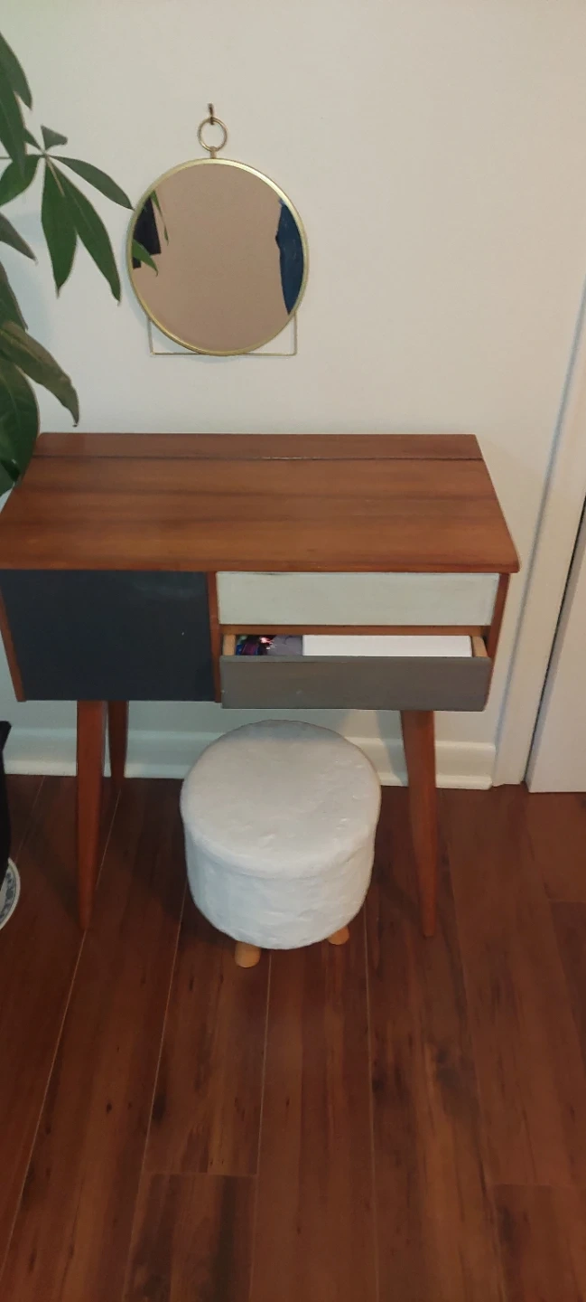 Selling a charming mid-century modern vanity table, perfect for adding a touch of retro style to your space! It comes with a matching stool. The vanity features a wooden top, painted drawers, and sleek tapered legs. It's in great condition and ready to use!
