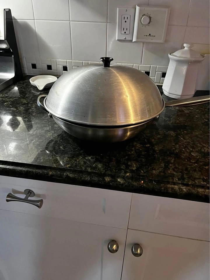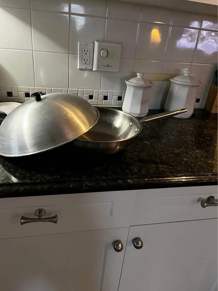 Stainless steel sauté pan with matching lid. Gently used and in good condition. Clean, sturdy, and perfect for everyday cooking—great for sautéing, frying, or simmering. No dents or damage, just normal light wear from use. Pick up in Brighton Jan 5 1 pm NES7