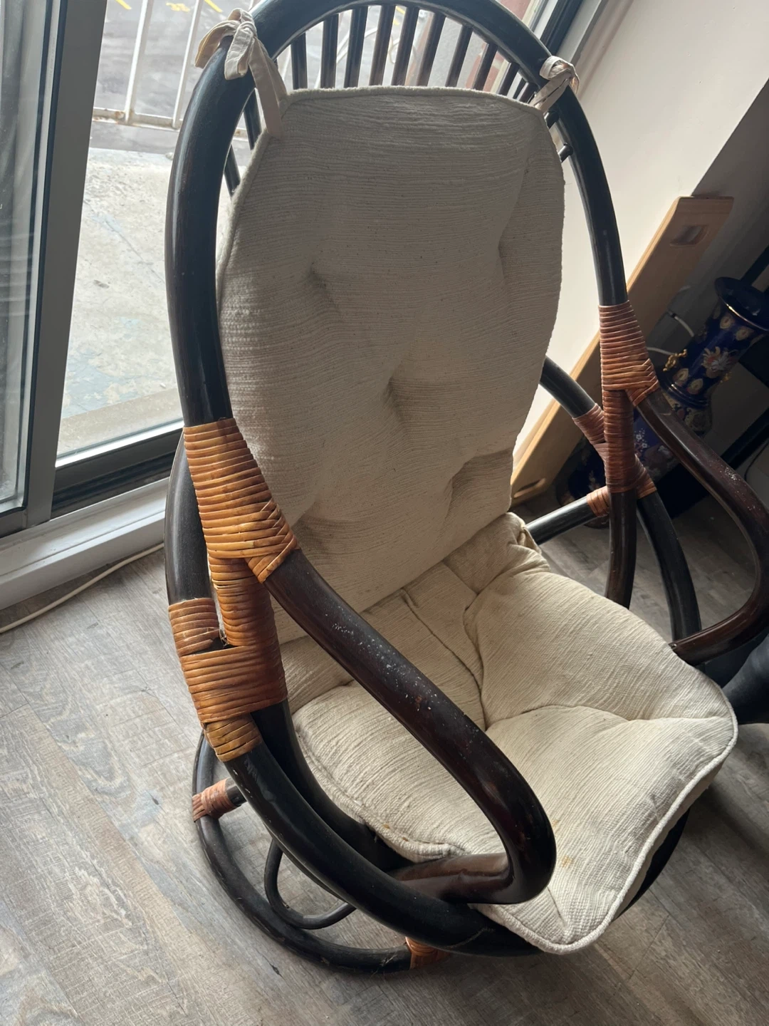 Selling a vintage wicker swivel cochair with a comfy cushion! The chair is in good condition and would be a great addition to any room. It's perfect for relaxing and unwinding after a long day