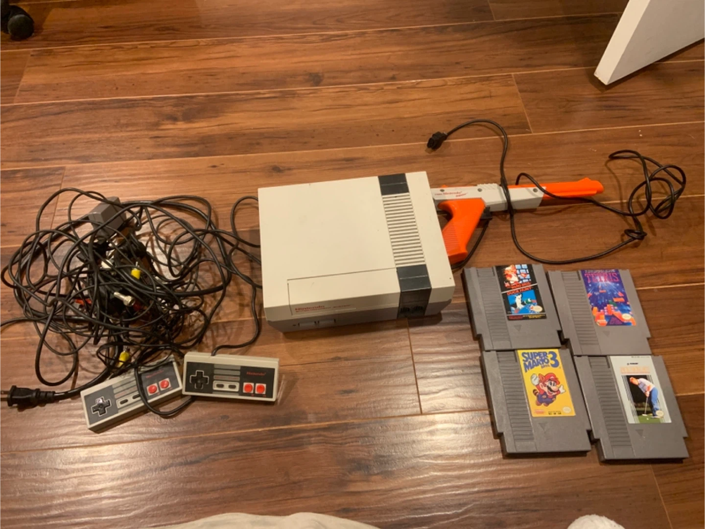 Selling a classic Nintendo NES console! Includes the console itself, two controllers, the zapper light gun, and a few games like Super Mario Bros/Duck Hunt, Tetris, Super Mario Bros 3, and Jack Nicklaus' Greatest 18 Holes of Golf. Hours of retro fun!