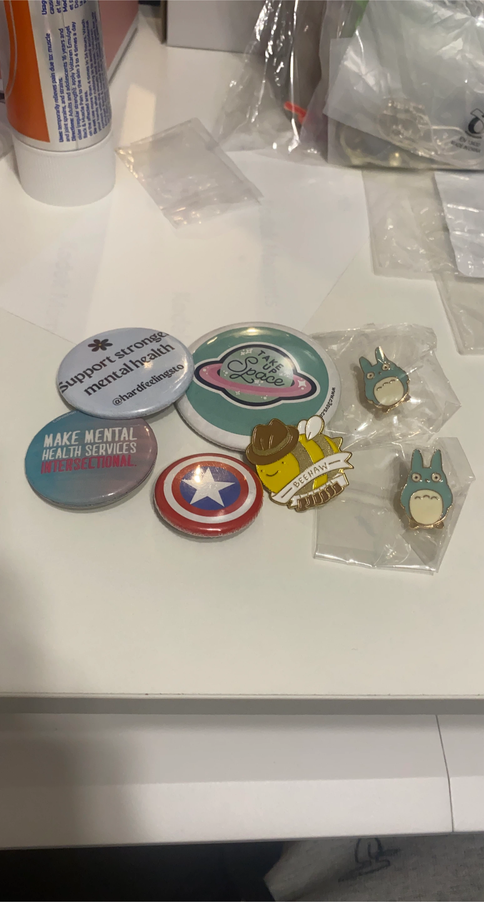 a a collection of cute pins! Mental wellness pins, a Captain America pin, a 'Beehaw' pin, and two Totoro pins still in their original packaging.